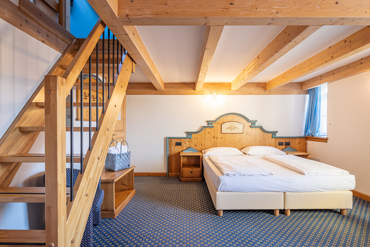 Junior Suite 2/3/4/5 - 33 m² - pokoj s manželskou postelí, v rámci zvýšeného neuzavřeného patra s 1 či 2 samostatnými lůžky a případně rozkládacím gaučem pro 2 osoby, sociální zařízení, orientace na jih