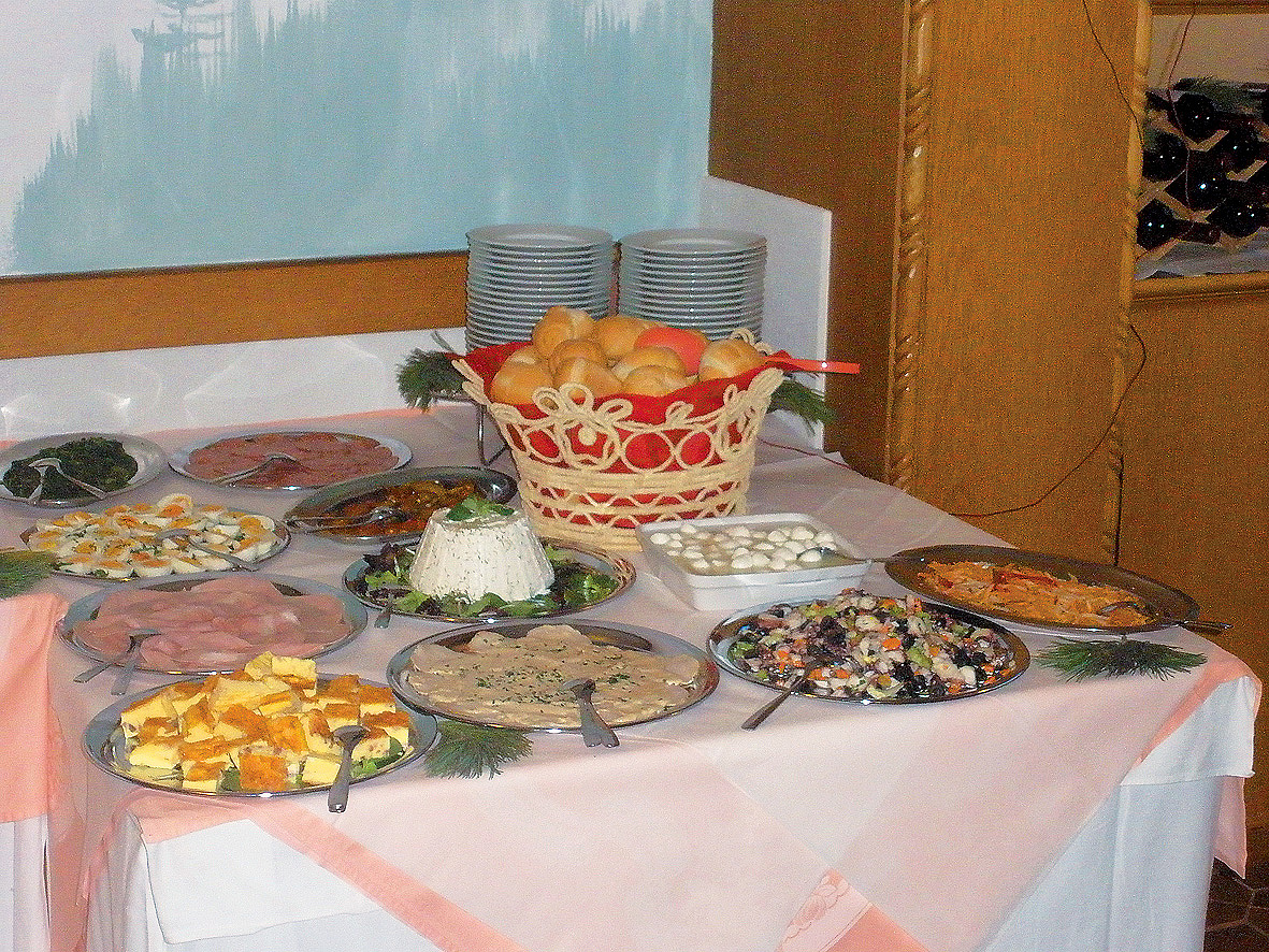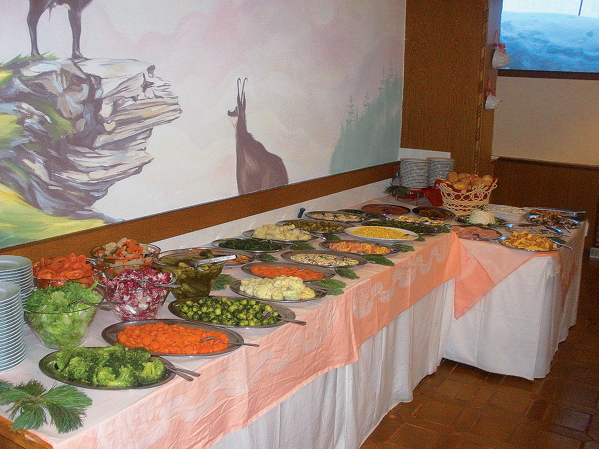 večeře - servírované menu s výběrem ze 2 až 3 teplých předkrmů a 2 až 3 hlavních jídel s přílohou, studené předkrmy formou bufetu, salátový bufet, servírovaný dezert / ovoce, nápoje za poplatek