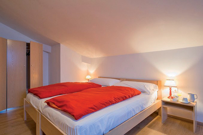 pokoj s 1 samostatným lůžkem či manželskou postelí a případně rozkládacím gaučem pro 1 či 2 osoby, některé čtyřlůžkové pokoje s atypickým rozkládacím gaučem na palandu, sociální zařízení se sprchou či vanou; výhled ke svahu