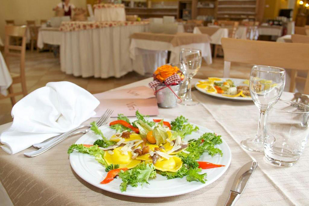 večeře - servírované menu s výběrem ze 2 až 3 teplých předkrmů, 2 až 3 hlavních jídel s přílohou, studený předkrm a dezerty formou bufetu, salátový bufet, nápoje za poplatek