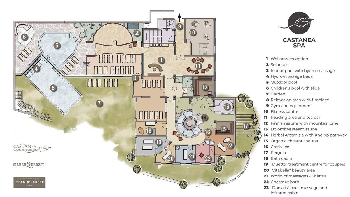 venkovní vyhřívaný bazén s vířivkou a bazén kulatého tvaru s vířivkou (celkem 100 m²), dětský bazének se skluzavkou, finská sauna#, biosauna#, pára#, Knejppův chodník#, 3x relaxační koutek# s lehátky, posilovna# , masáže*# ,kosmetické služby*#, stolní tenis, stolní fotbal, služby označené # mohou využívat jen osoby od 18 let