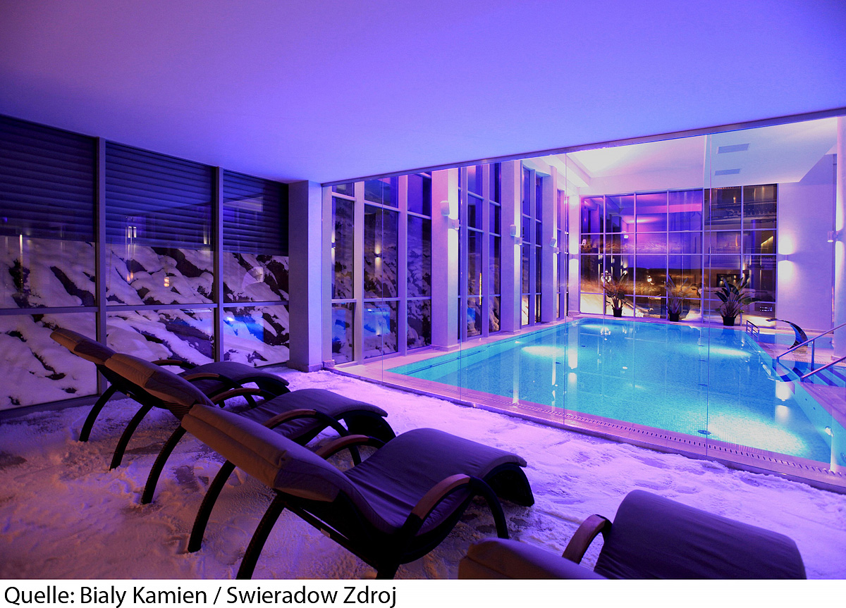 bazén 60 m² s protiproudem, dětský bazének se skluzavkou, finská sauna, pára, solná jeskyně, vířivka se slanou vodou, venkovní vířivka, tepidarium, relaxační koutek s lehátky, masáže*, kosmetické služby*