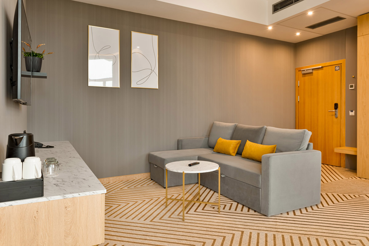 26 až 28 m² – pokoj s manželskou postelí 180x200 cm či s oddělitelnými lůžky a rozkládacím gaučem formou přistýlky až pro 2 děti do nedovršených 10 let (šířka 120 cm), sociální zařízení, balkón