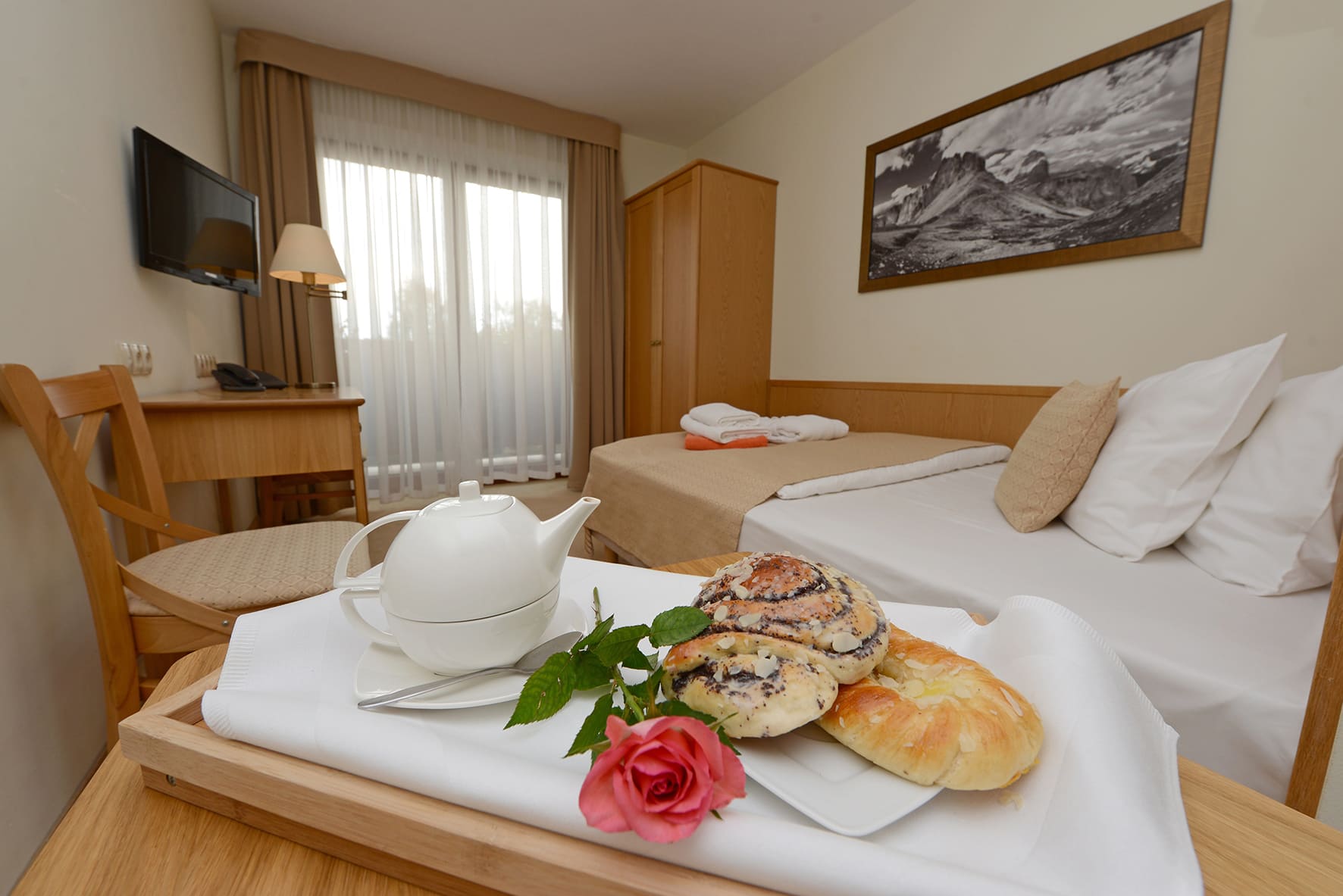 15 m² - pokoj s manželskou postelí či 2 samostatnými lůžky a možností 1 přistýlky pro dítě do 12 let, sociální zařízení, většina pokojů s balkonem