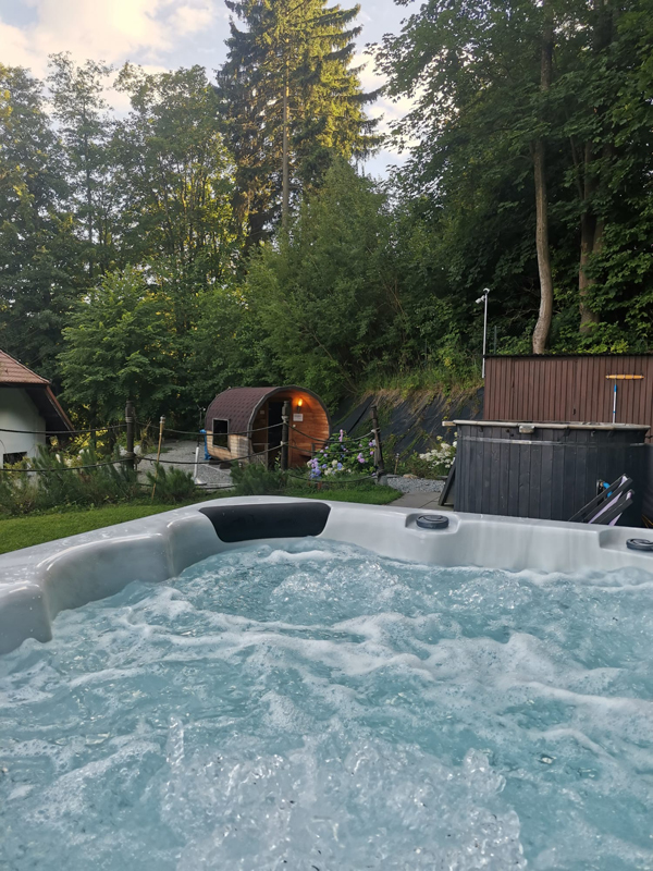 vnitřní bazén, vnitřní vířivka pro 12 osob, venkovní vířivka, finská sauna, venkovní finská sauna, infrasauna, posilovna, koupele se solankovou vodou, kád s horkou vodou, léčebné procedury*, masáže*