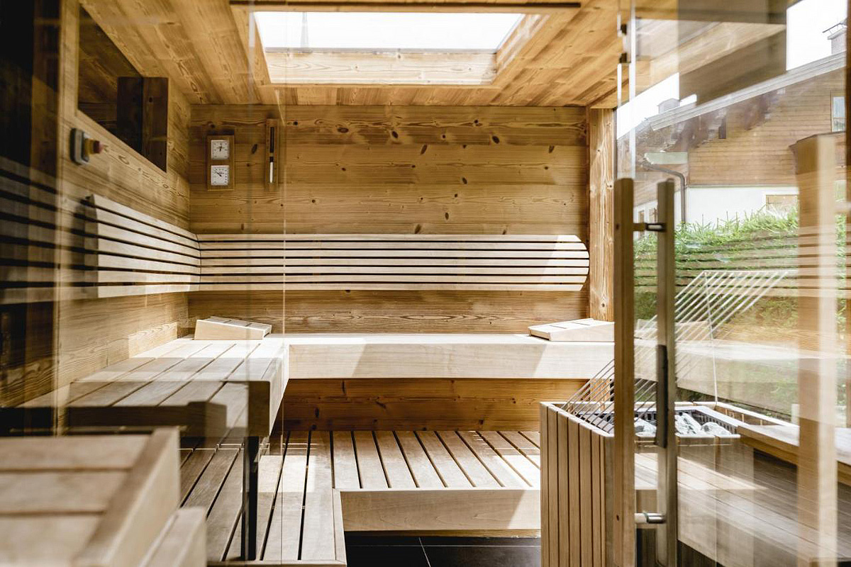 krásný bazén s protiproudem a v zahradě celodřevěná sauna s panoramatickým výhledem na pohoří Tennengebirge