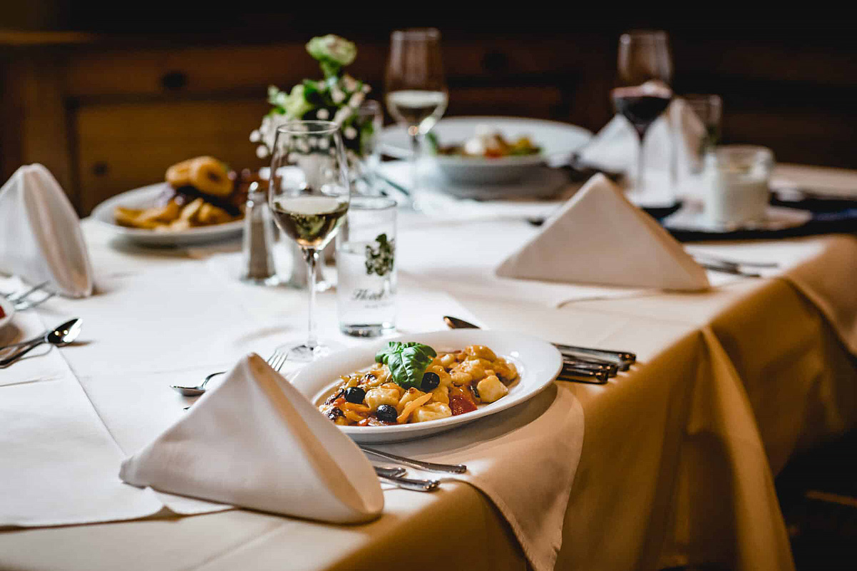 večeře - servírované 4chodové menu s výběrem hlavních jídel s přílohou, servírovaný studený či teplý předkrm či polévka, salátový bufet, servírovaný dezert, nápoje za poplatek, nepravidelné tematické bufety