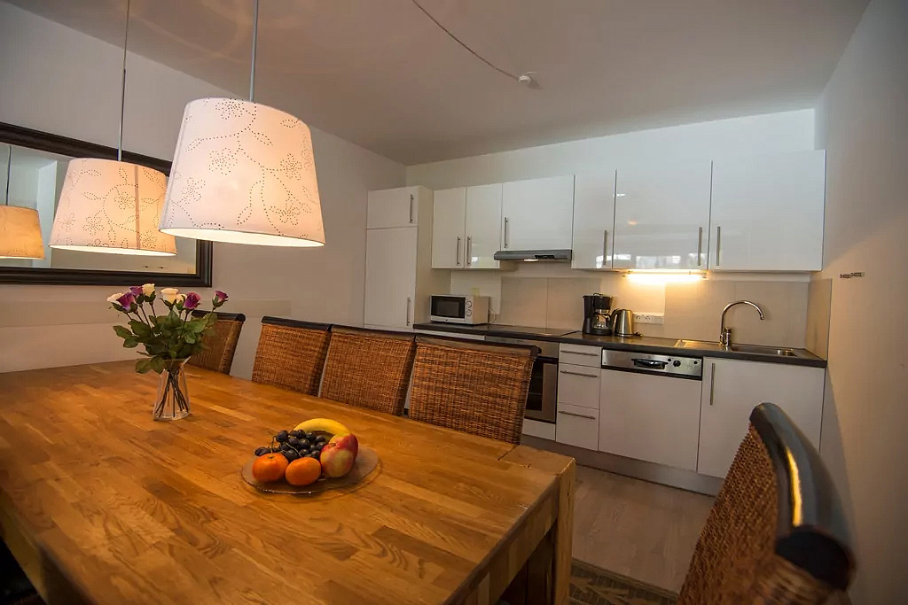 70 m² - ložnice s manželskou postelí, ložnice s manželskou postelí a palandou pro 2 osoby, obývací pokoj s rozkládacím gaučem pro 2 osoby a kuchyňským koutem, 2x sociální zařízení, balkon či terasa