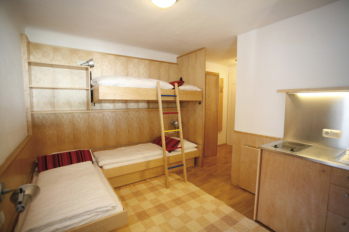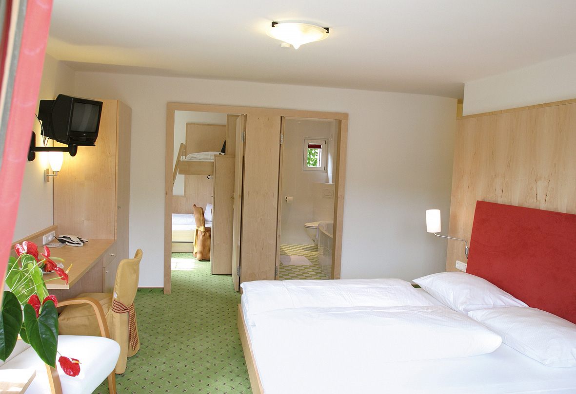 pokoj s manželskou postelí, menší pokoj s rozkládacím gaučem či palandou až pro 2 osoby či manželskou postelí oddělený posuvnými či propojovacími dveřmi (možná i varianta 2 pokojů naproti sobě bez propojení), sociální zařízení, balkon; pokoje jsou orientovány na jižní stranu s přímým či částečným výhledem na jezero a jsou v hlavní či vedlejší budově; minimální obsazenost 2 dospělí a 2 děti od 6 let