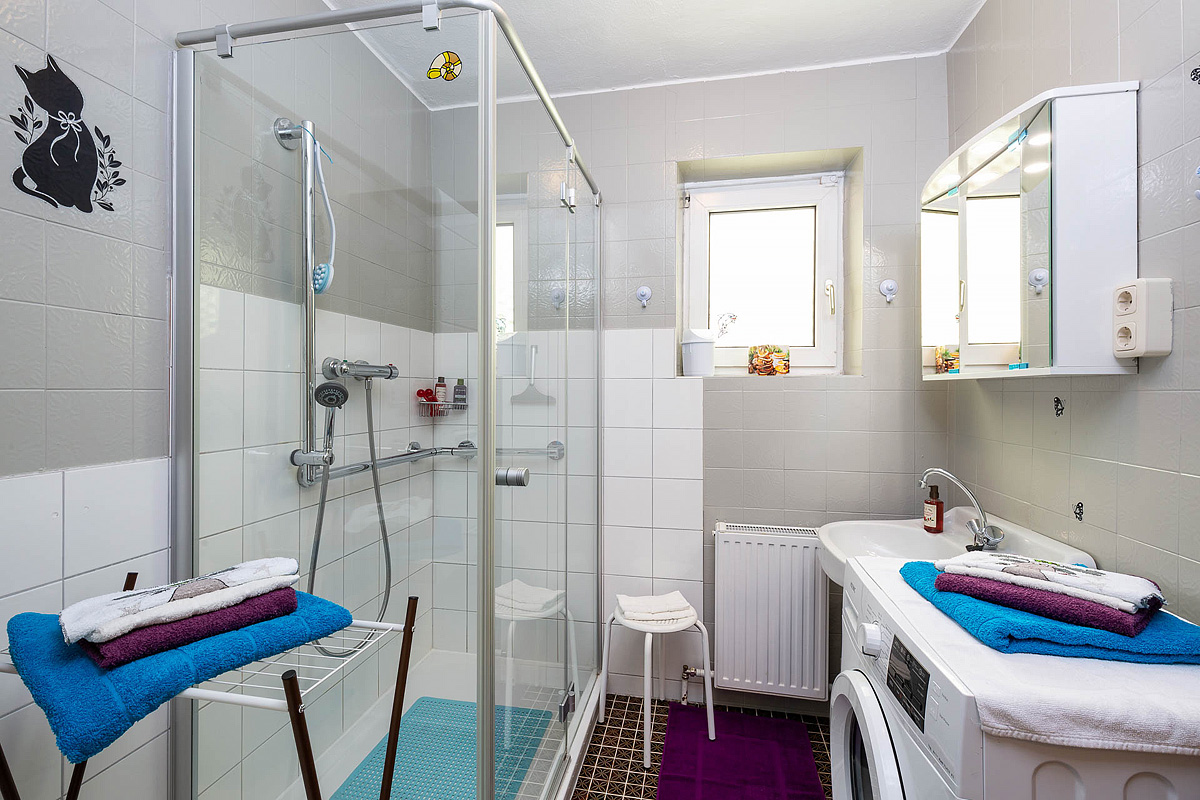 60 m² - ložnice s manželskou postelí, ložnice s 1 samostatným lůžkem a rozkládacím gaučem pro 1 osobu (na vyžádání vč. ceny lze až pro 2 děti do nedovršených 10 let), samostatná kuchyň s jídelním koutem, sociální zařízení, oddělené WC, terasa