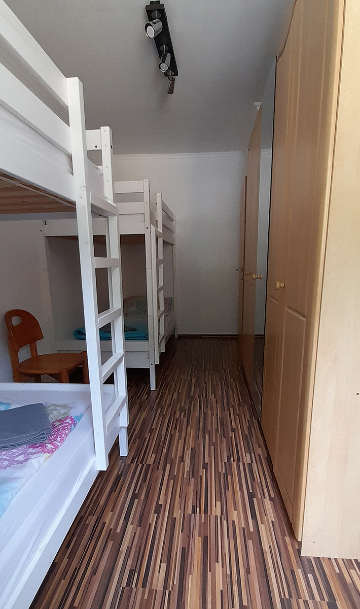 trilo 6/7 - 60 až 65 m² - ložnice s manželskou postelí a případně dalším samostatným lůžkem, ložnice se 2 palandami pro 4 osoby, obývací pokoj s gaučem, samostatná kuchyň, sociální zařízení