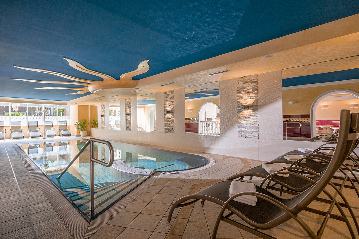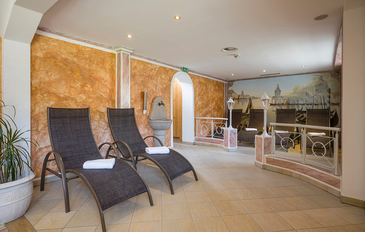 bazén 48 m² s vířivkou*, sauna, finská sauna, bio sauna, pára, infrakabina, horizontální solárium*, relaxační koutek s lehátky, posilovna, masáže*; děti mají do wellness přístup pouze v doprodu dospělé osoby