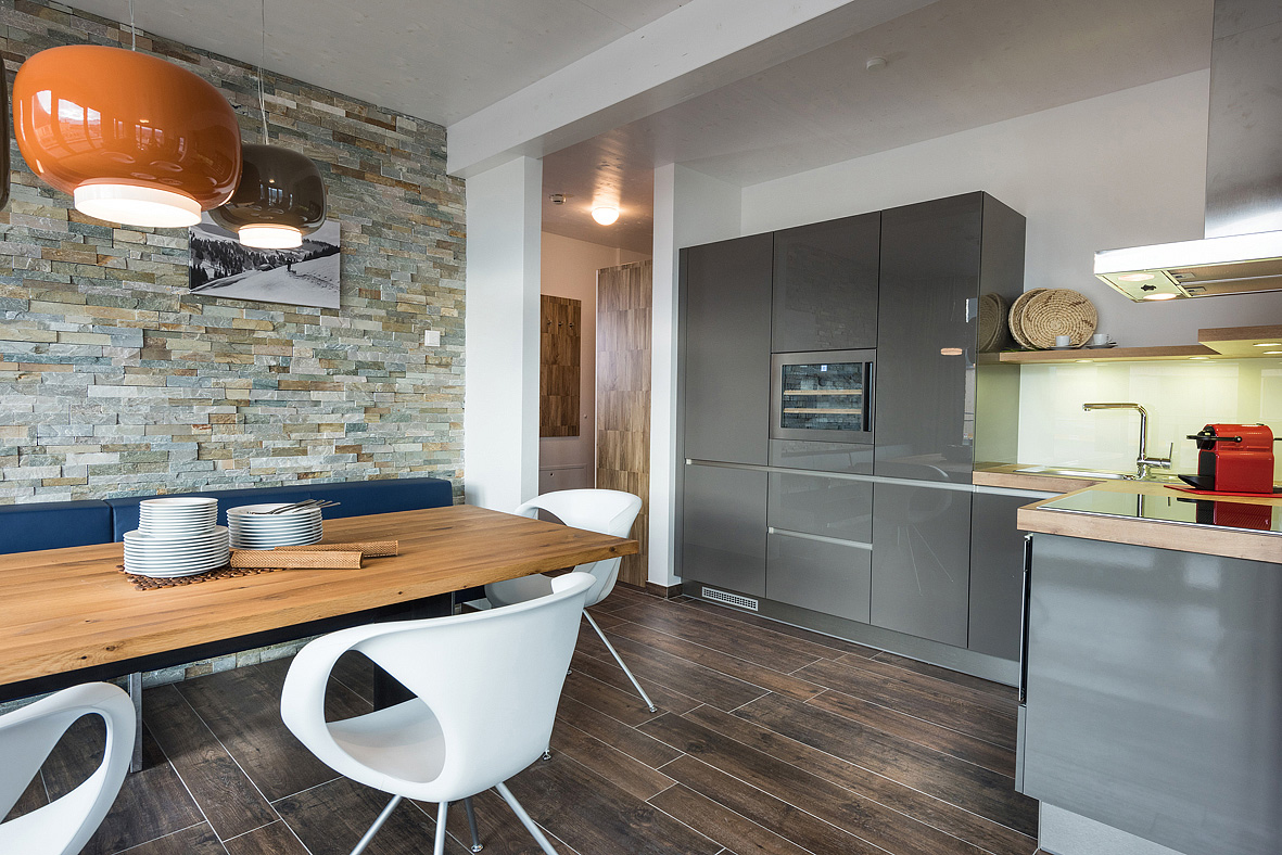 90 m² - 3 ložnice s manželskou postelí, obývací pokoj s kuchyňským koutem a případně rozkládacím gaučem pro 2 osoby, předsíň / šatna, 2x až 3x sociální zařízení se sprchou či vanou, úschovna lyží a lyžařských bot, balkon