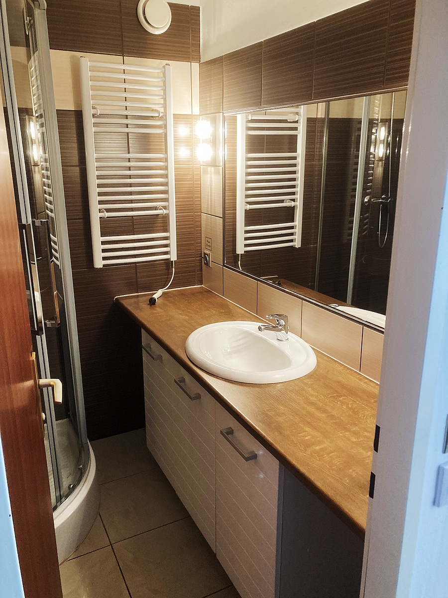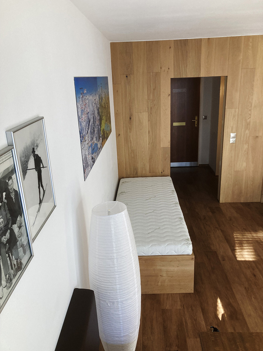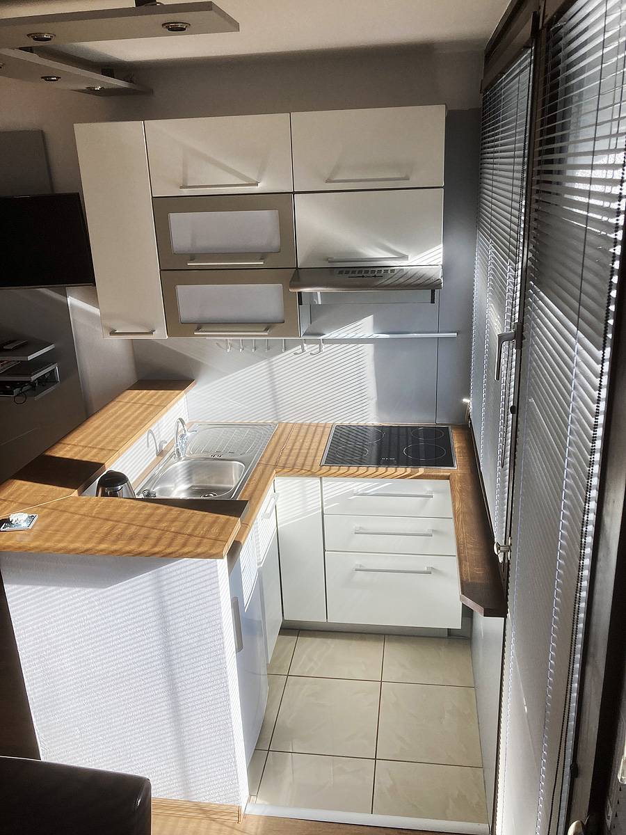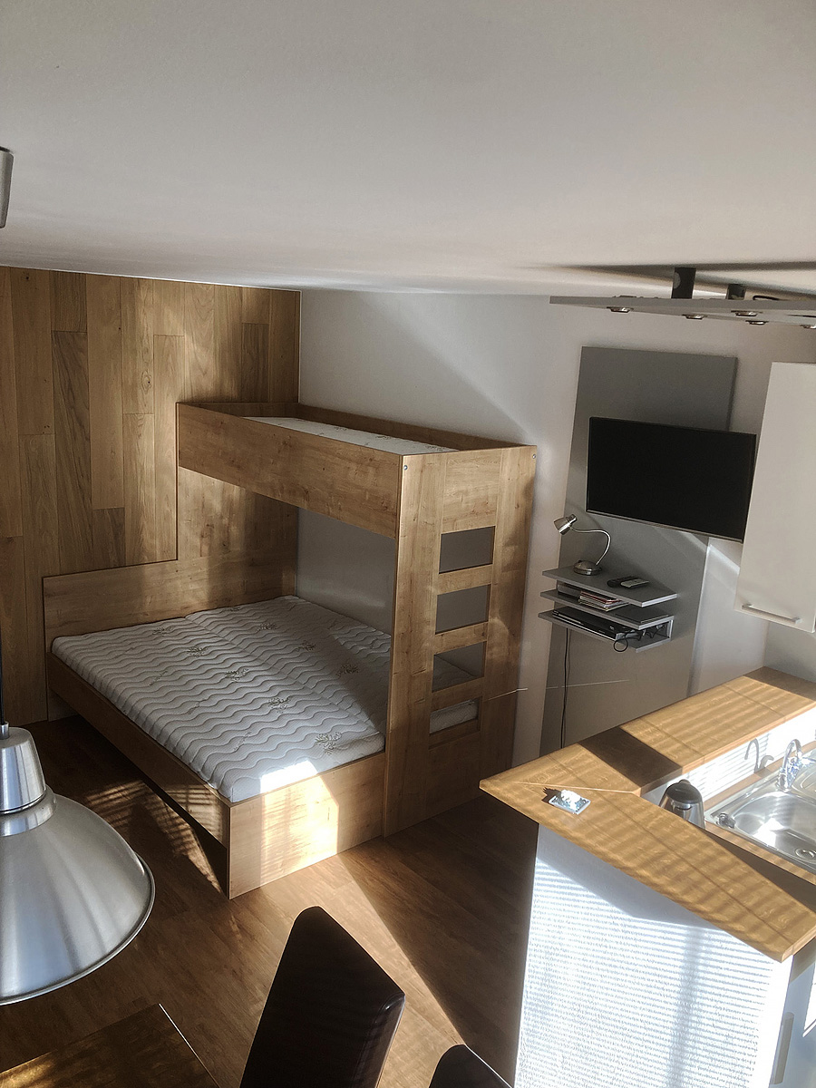 29 m² - obývací pokoj s manželskou postelí a atypickou palandou pro 2 osoby, kuchyňský kout ve vstupní chodbě, sociální zařízení, balkon