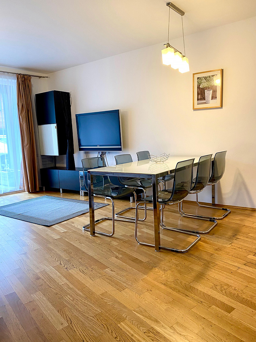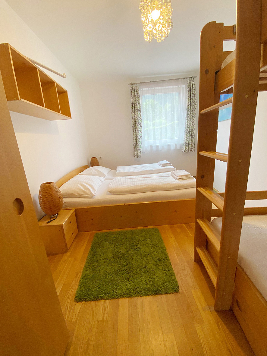 65 m² - 1 ložnice s manželskou postelí, 1 ložnice s manželskou postelí a palandou, obývací pokoj s kuchyňským koutem a rozkládacím gaučem pro 2 osoby, sociální zařízení, terasa