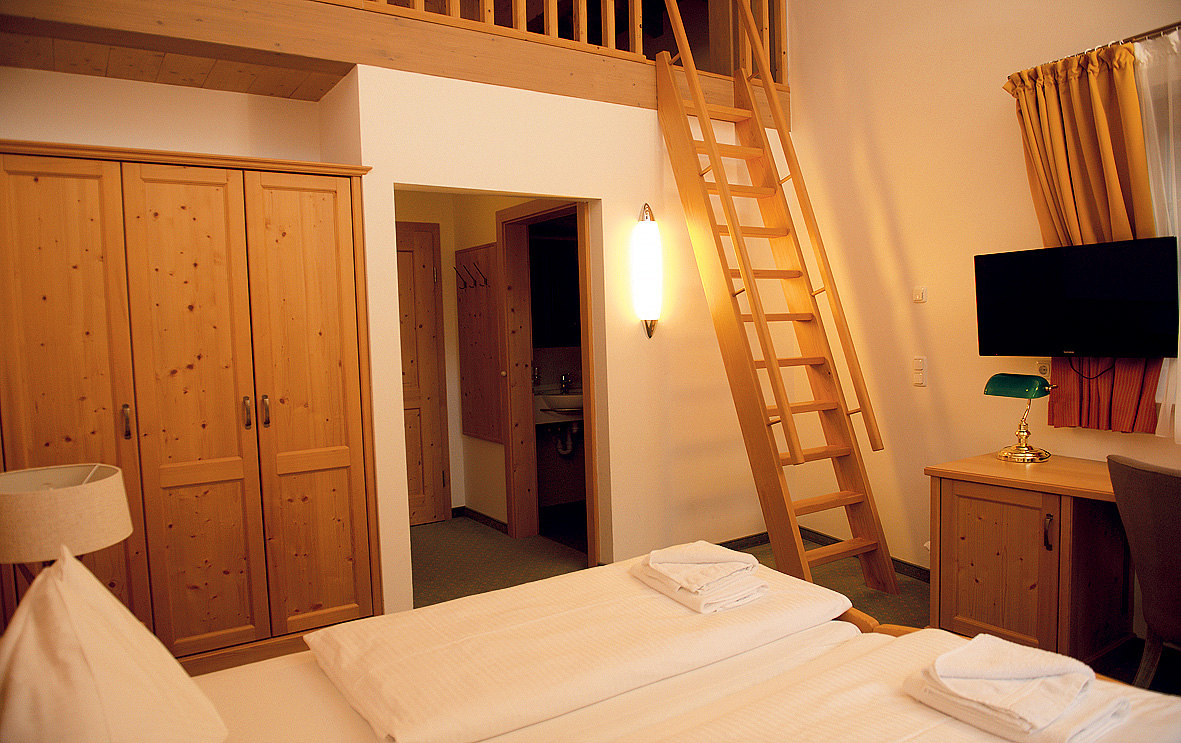 obývací pokoj se 2 samostatnými lůžky či manželskou postelí, neuzavřené zvýšené patro v rámci obývacího pokoje s 1 samostatným lůžkem a případně dalším lůžkem pro 1 osobu, sociální zařízení, zpravidla balkon