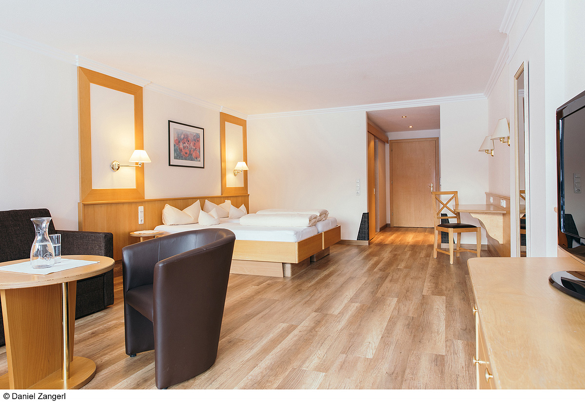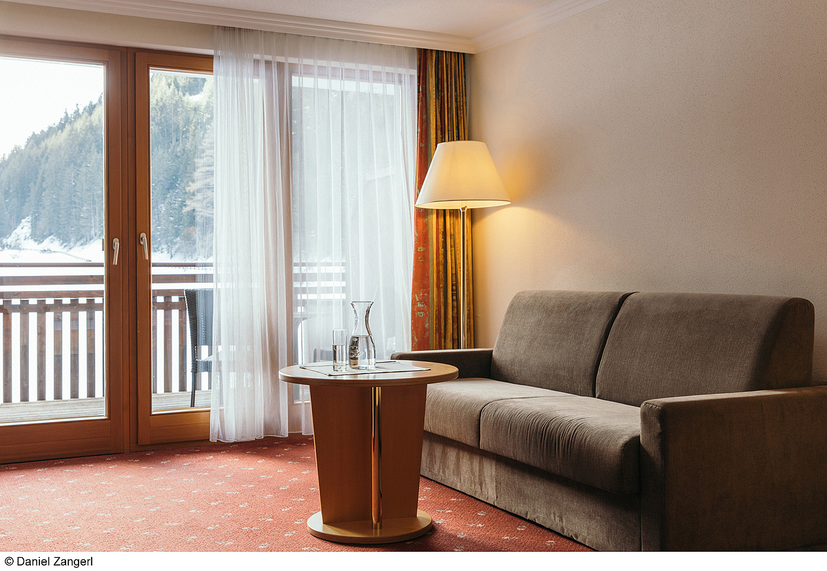 Suite Gletscherblick 2+2 - 34 m² - pokoj s manželskou postelí a rozkládacím gaučem pro 1 dospělou osobu a 1 dítě do nedovršených 15 let či 2 děti do nedovršených 15 let, sociální zařízení s vanou, balkon či terasa zpravidla s výhledem na hory