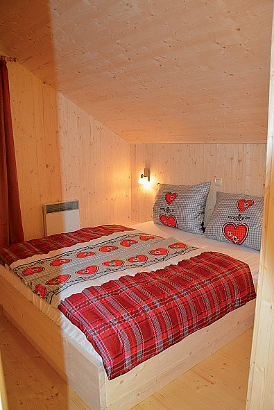 100 m² - chalet o 2 podlažích; obývací pokoj s kuchyňským koutem, 2 ložnice s manželskou postelí, ložnice s palandou a 1 samostatným lůžkem, 2 až 3x sociální zařízení, finská sauna, venkovní vířivka, balkon a terasa