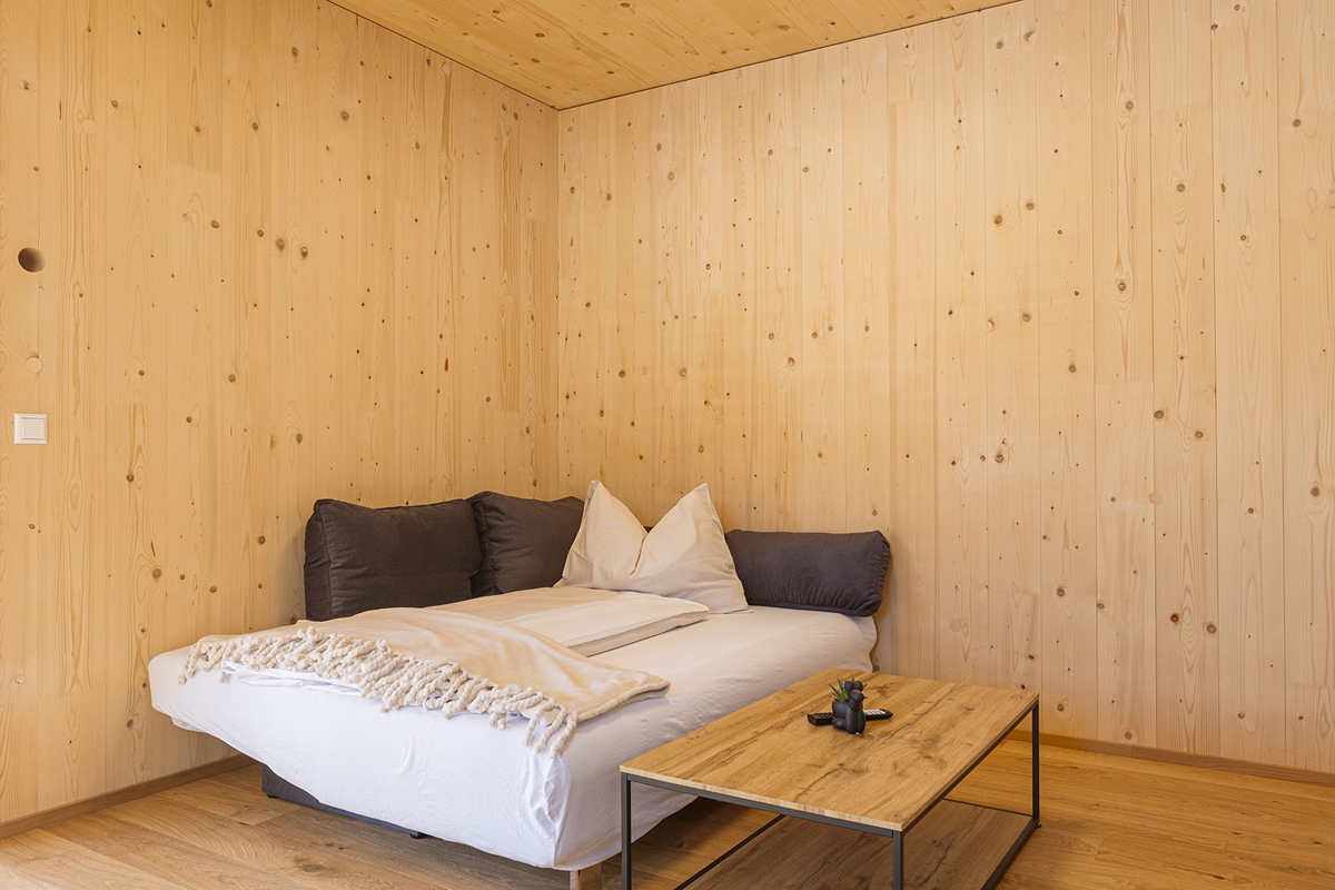 bilo 4 sauna - 40 m² - ložnice s manželskou postelí, obývací pokoj s kuchyňským koutem a rozkládacím gaučem pro 2 osoby, sociální zařízení s privátní finskou saunou, balkon či terasa