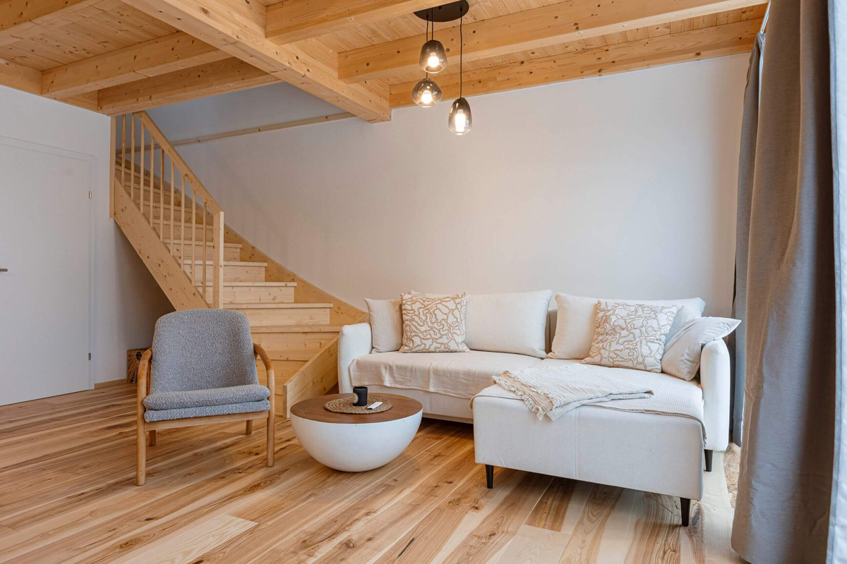 45 m² - v neuzavřeném patře ložnice s 1 samostatným lůžkem, obývací pokoj s kuchyňským koutem a rozkládacím gaučem pro 2 osoby, sociální zařízení s privátní saunou, balkon či terasa