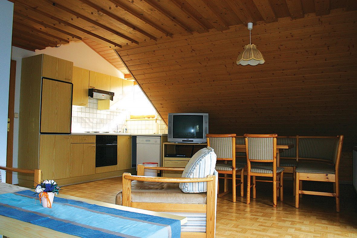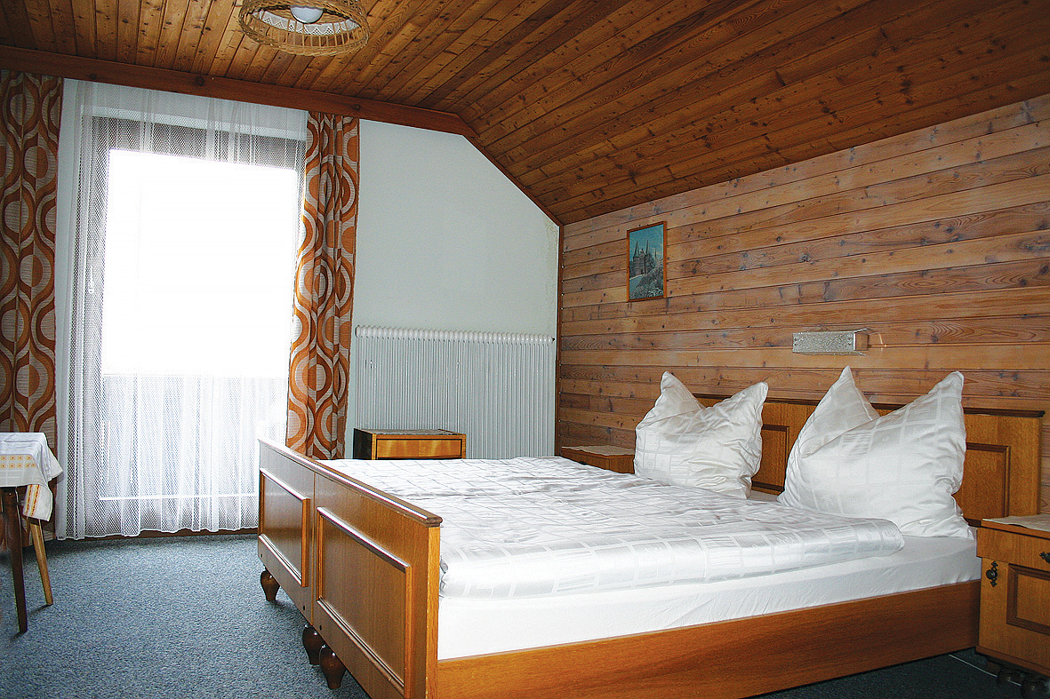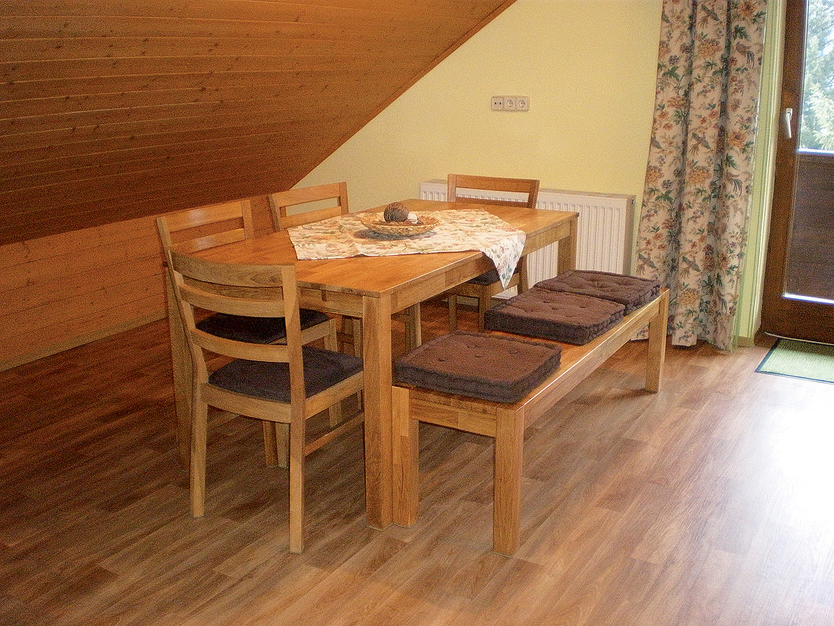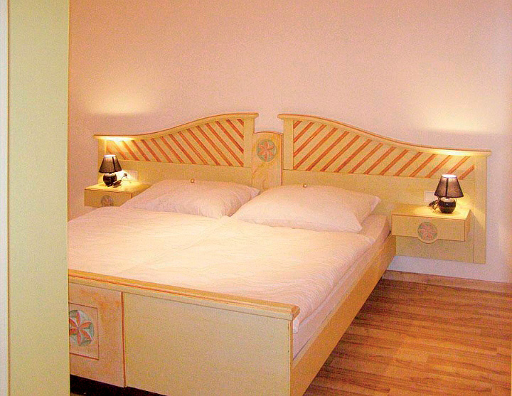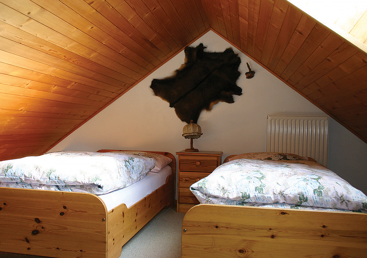trilo 6 typ A - 65 až 70 m² - 1 ložnice s manželskou postelí, 1 ložnice zpravidla se 2 samostatnými lůžky (ložnice je situována do velmi nízkého mezonetového podkroví; přístup po příkrých schodech), obývací pokoj s kuchyňským koutem a 2 gauči pro 1 osobu, sociální zařízení, balkon