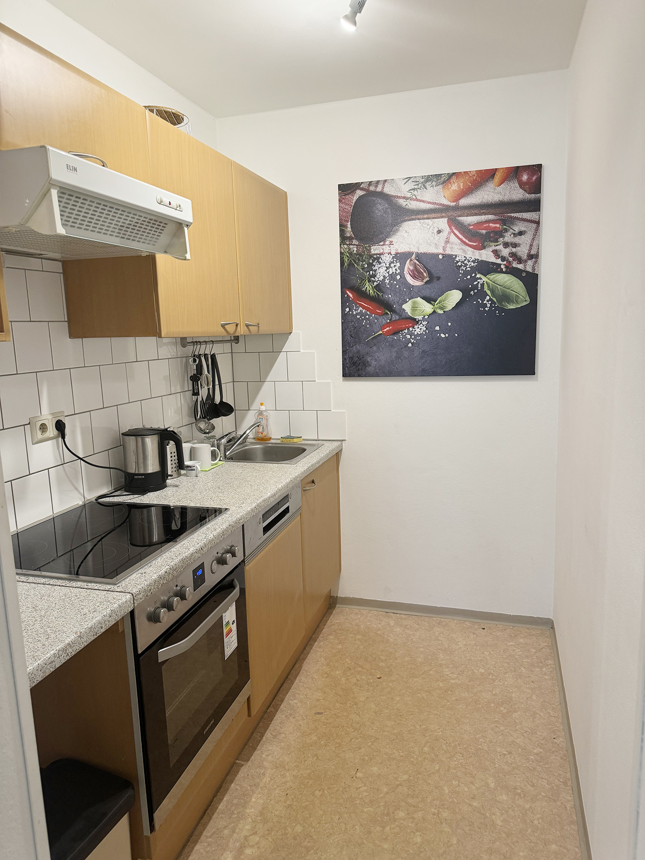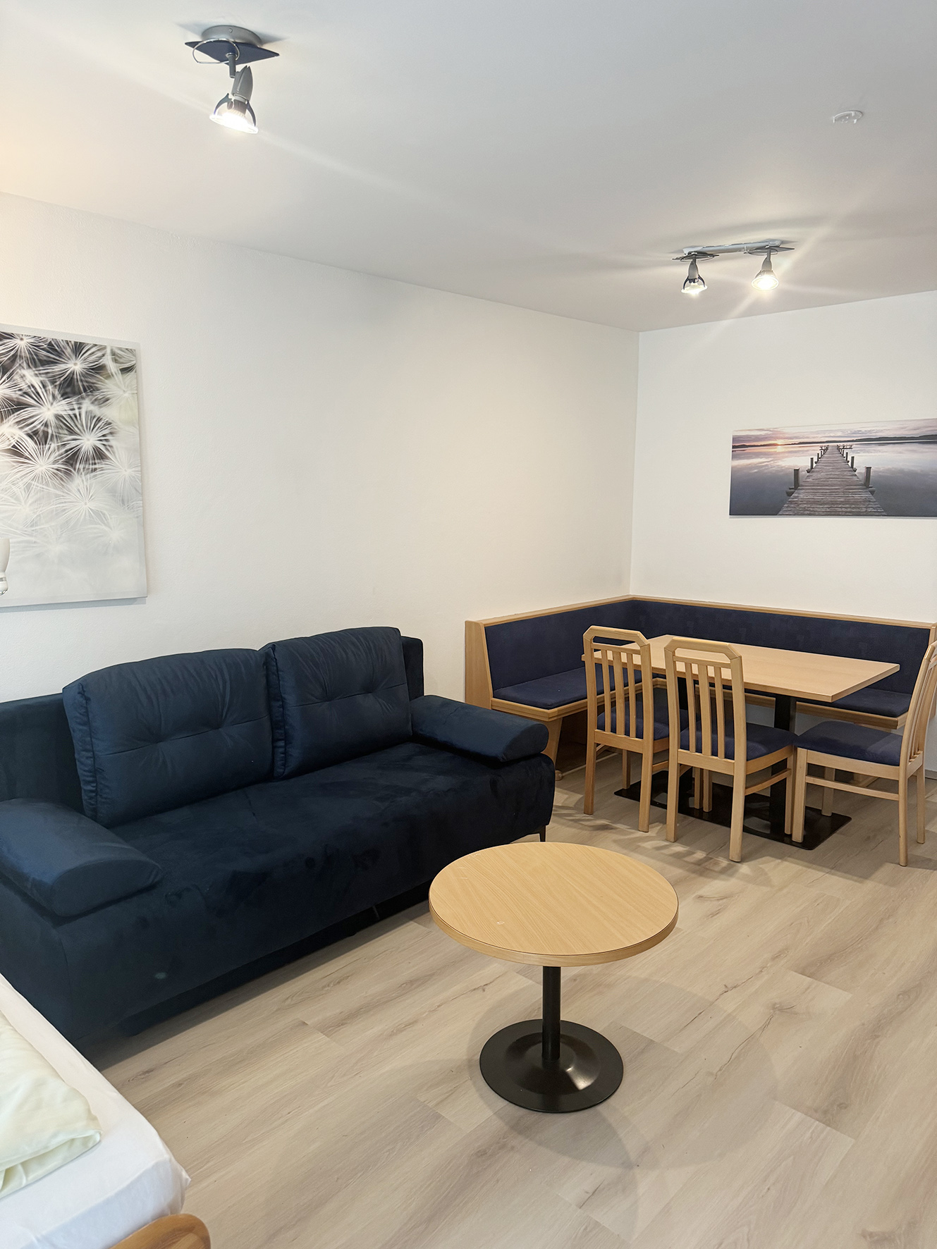 mono 4 - 43 m² - obývací pokoj s kuchyňským koutem, rozkládacím gaučem pro 2 osoby oddělený skříňovou stěnou od manželské postele, sociální zařízení, balkon