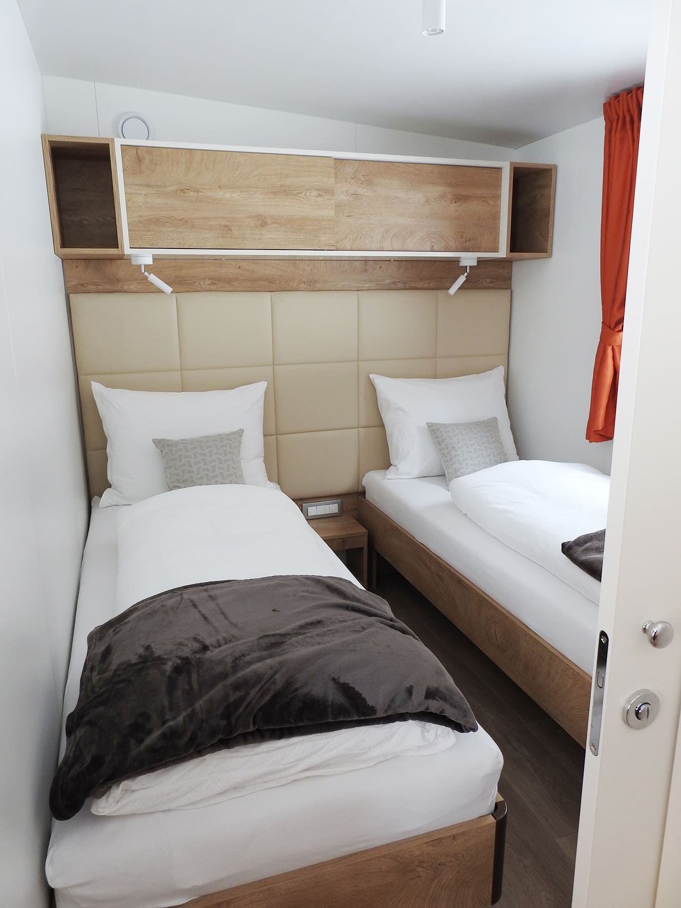 65 m² - 1. podlaží chaletu: obývací pokoj s kuchyňským koutem a rozkládacím gaučem pro 2 osoby, kamna (dřevo volně k dispozici), předsíň, oddělené WC, terasa; 2. podlaží chaletu: ložnice s manželskou postelí, šatna, ložnice se 2 samostatnými lůžky, sociální zařízení