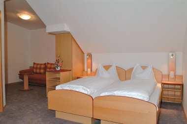 pokoj s manželskou postelí či 2 samostatnými lůžky a případně rozkládacím gaučem pro 2 osoby či palandou, výjimečně jako 2 samostatné místnosti, sociální zařízení se sprchou či vanou, zřídka balkon