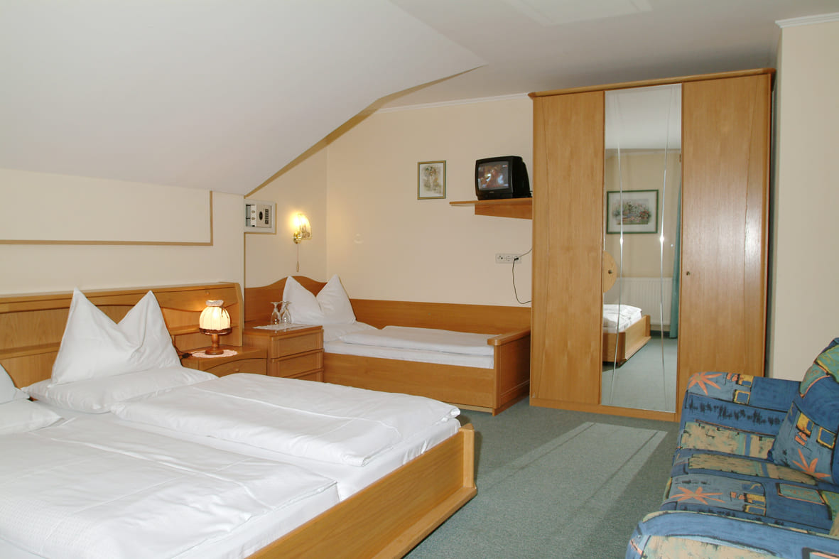 pokoj s manželskou postelí či 2 samostatnými lůžky a případně rozkládacím gaučem pro 1 osobu, sociální zařízení se sprchou či vanou, zřídka balkon