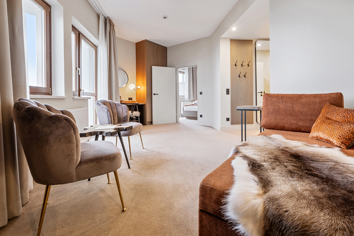 Mansarde 5 - 38 m² - pokoj s manželskou postelí, menší pokoj se 2 samostatnými lůžky v neuzavřeném patře přístupném po schodech, obývací pokoj s rozkládacím gaučem pro 1 osobu, sociální zařízení s vanou, oddělené WC, balkon; pokoj lze obsadit nejméně 2 dospělými osobami a 2 dětmi; pokoje nedoporučujeme pro rodiny s dětmi do 4 let (kvůli schodům)