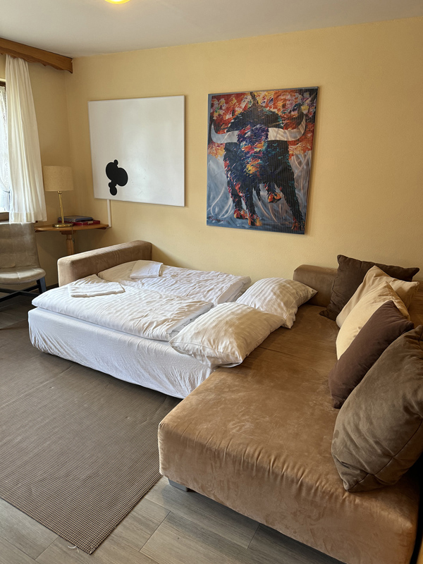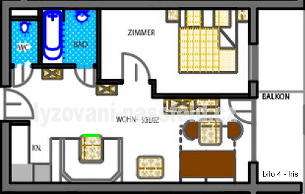 35 m² - obývací pokoj s kuchyňským koutem a manželskou postelí (160 x 200 cm) a opticky oddělenou palandou pro 2 osoby, předsíň, sociální zařízení, 2x balkon (1x s výhledem do údolí); apartmán je ve 3. patře