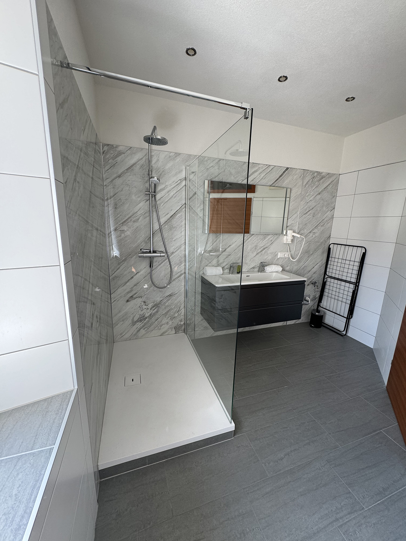110 m² - 2 ložnice s manželskou postelí, ložnice se 2 palandami, obývací pokoj s kuchyňským koutem, 2x sociální zařízení (bez WC; 1x se vstupem z ložnice), 1x oddělené WC, 2x terasa