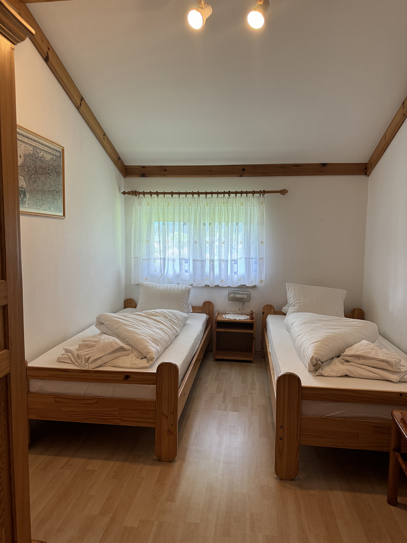 60 m² - 1 ložnice s manželskou postelí, ložnice se 2 samostatnými lůžky, obývací pokoj s kuchyňským koutem a rozkládacím gaučem (šíře 180 cm) pro 2 osoby, sociální zařízení se sprchou či vanou, oddělené WC, terasa; byt je v přízemí