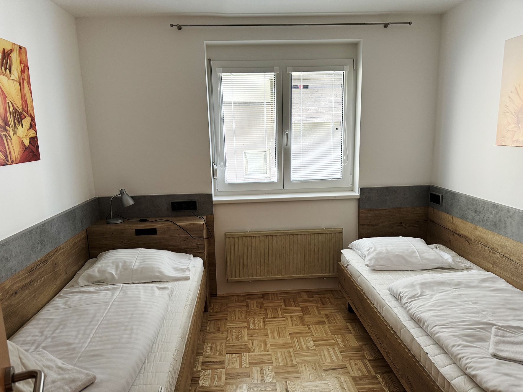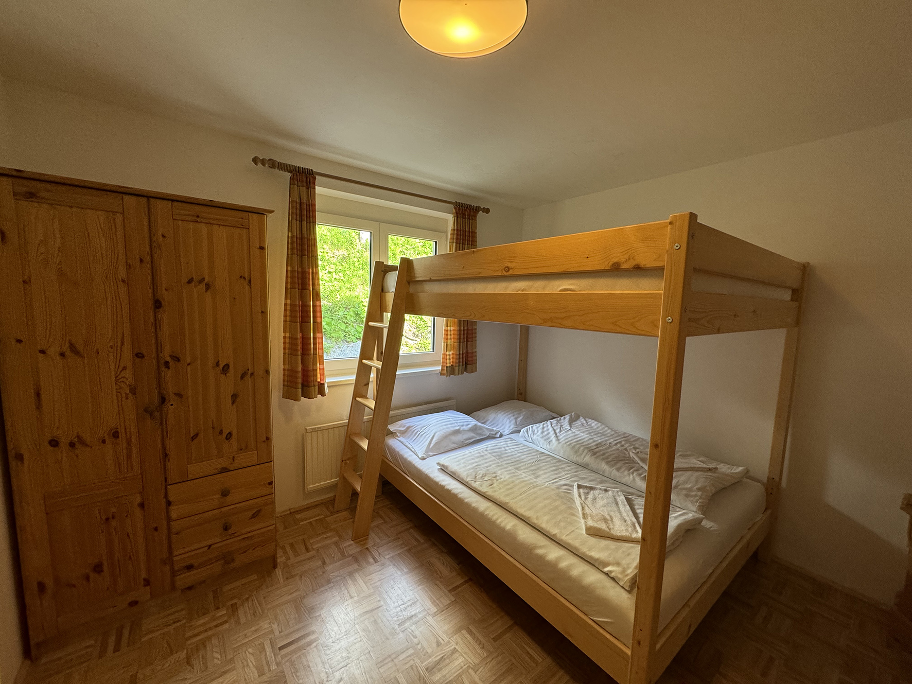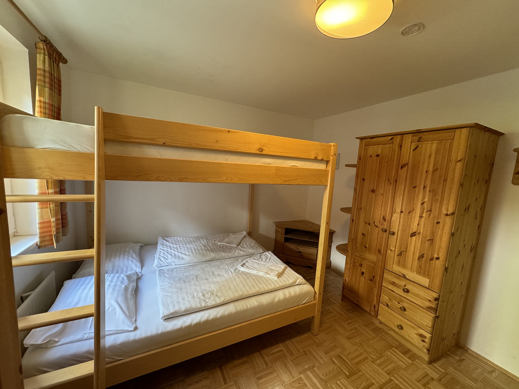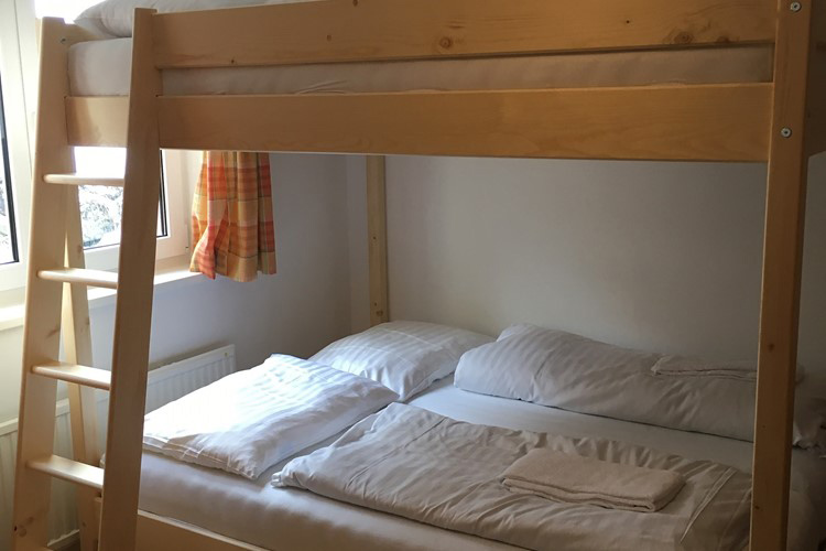 trilo 4+1 - 65 m² - 1 ložnice s manželskou postelí, ložnice se 2 samostatnými lůžky, obývací pokoj s kuchyňským koutem a rozkládacím gaučem pro 1 dítě do nedovršených 16 let, předsíň, sociální zařízení, oddělené WC, balkon; apartmán je v 1. patře; krb (jen jako nefunkční dekorace); NENÍ POVOLEN POBYT SE PSEM!