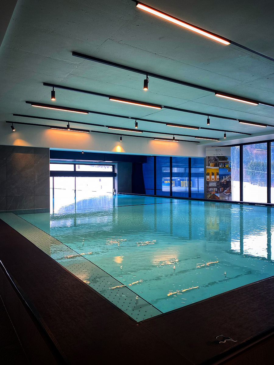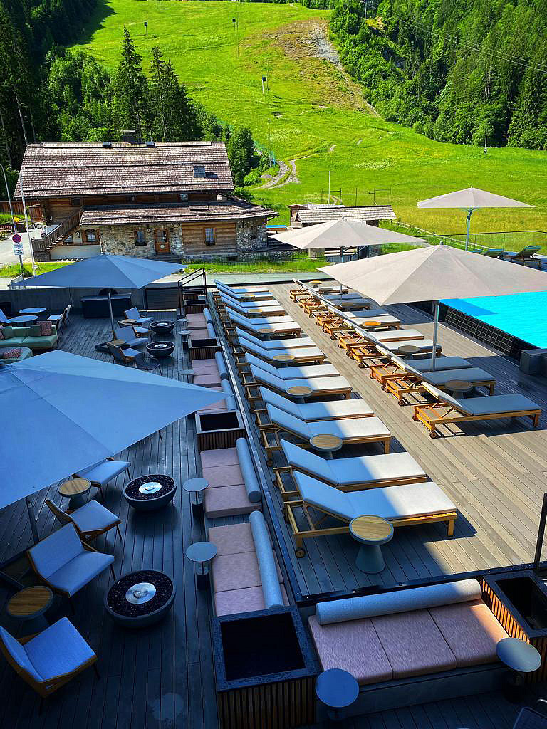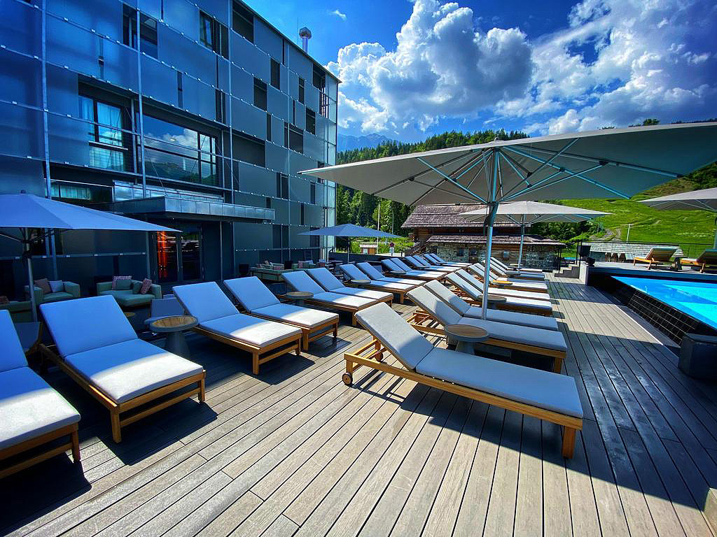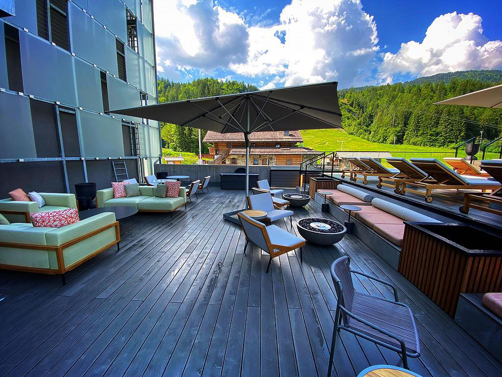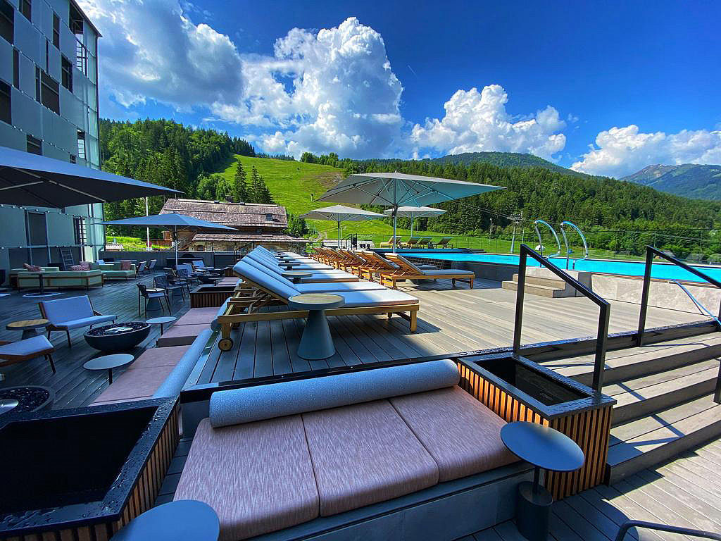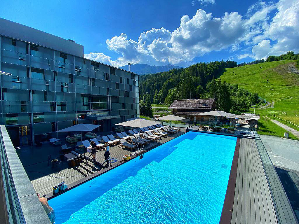 architektonicky zajímavý hotel u dolní stanice lanovky, venkovní vyhřívaný Infiniti bazén propojený s vnitřním bazénem a zcela netradičně vnitřní rampy a privátní ski depot přímo před každým pokojem