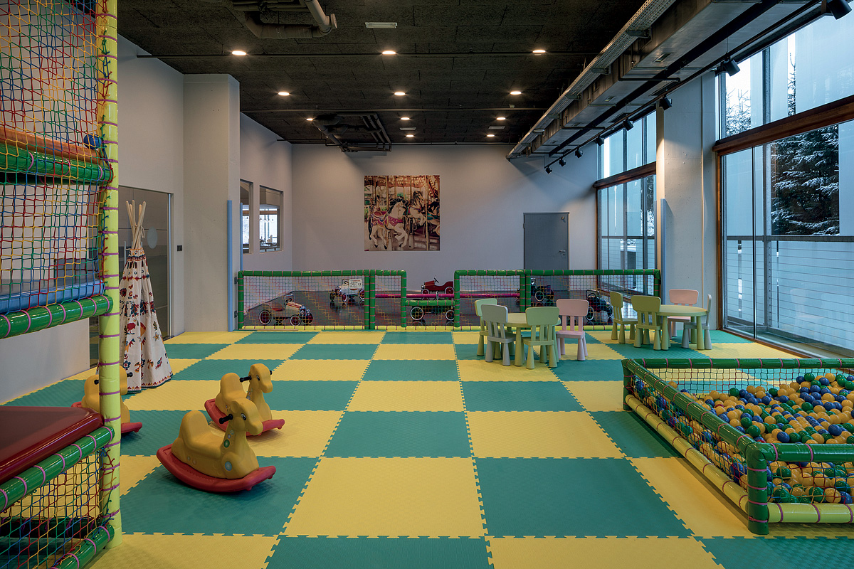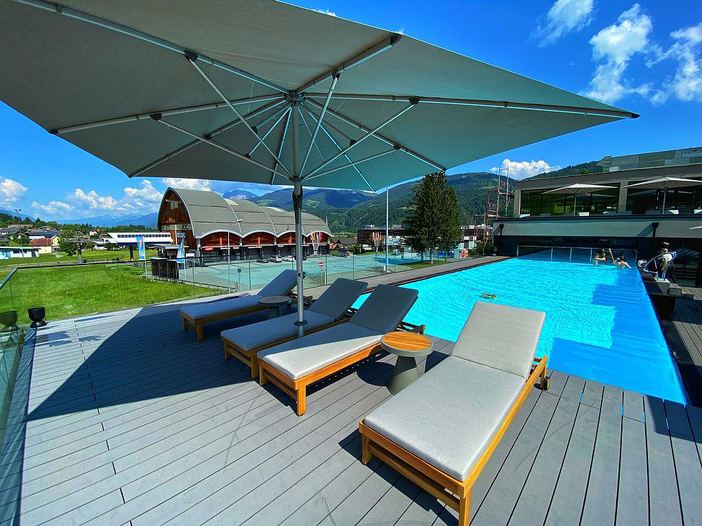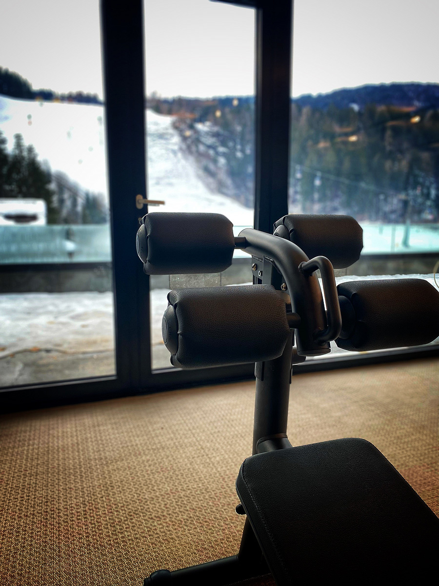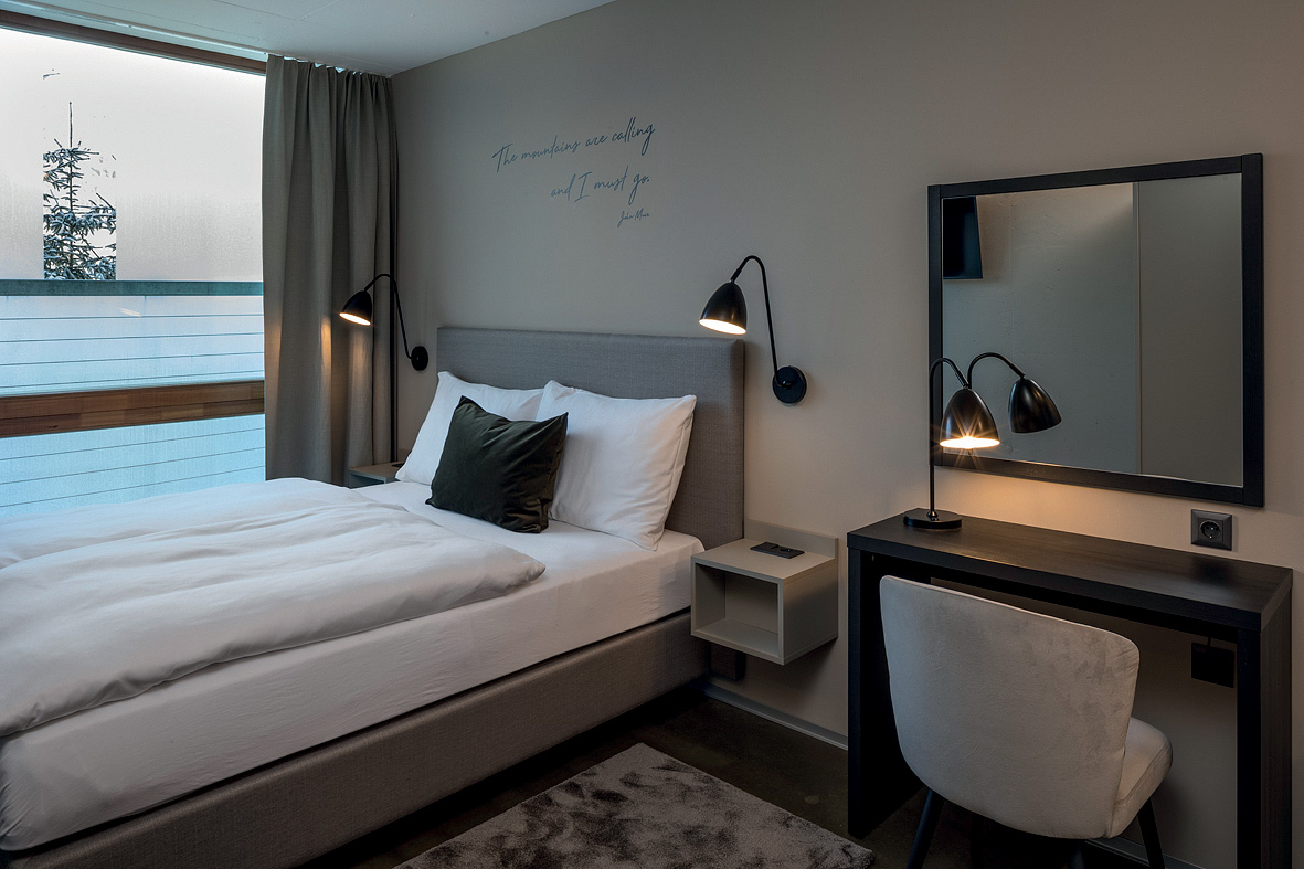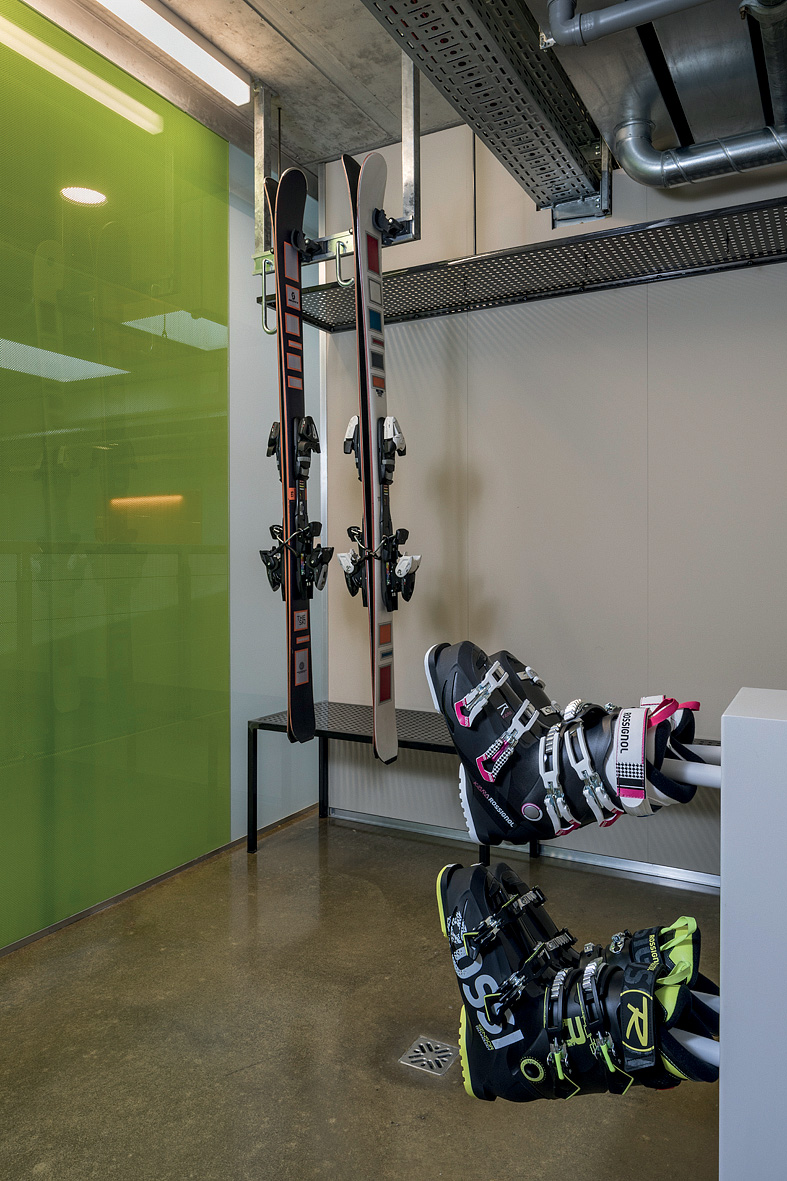 architektonicky zajímavý hotel u dolní stanice lanovky, venkovní vyhřívaný Infiniti bazén propojený s vnitřním bazénem a zcela netradičně vnitřní rampy a privátní ski depot přímo před každým pokojem