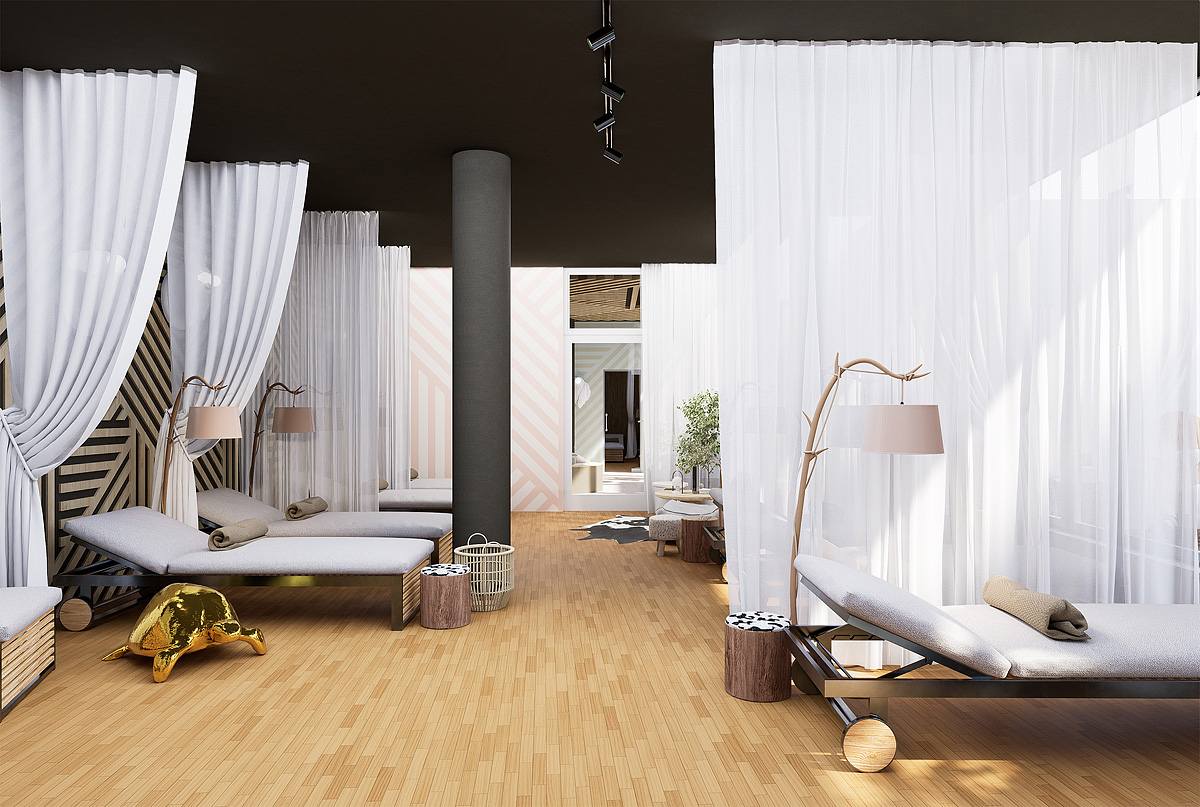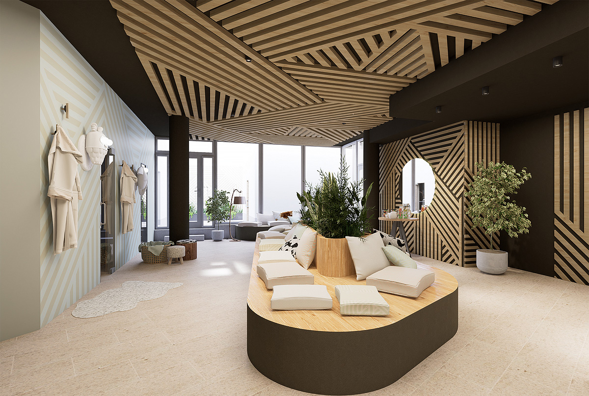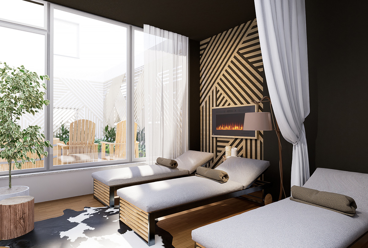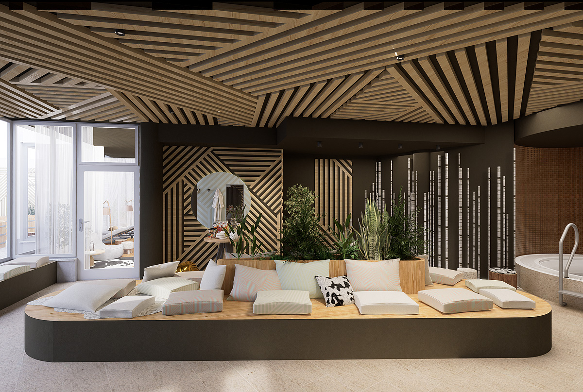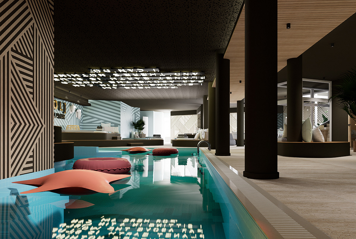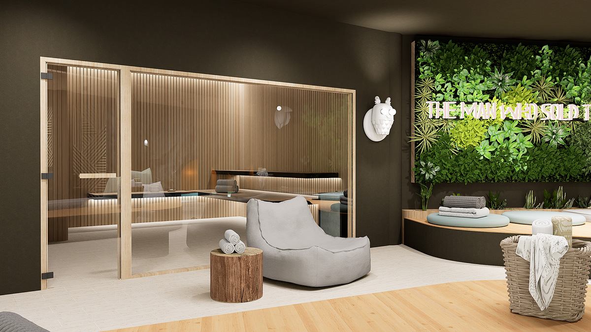 bazén 7 x 4 m, vířivka, venkovní "kelo" sauna, venkovní panoramatická sauna, finská sauna, pára, relaxační koutek s lehátky; posilovna, masáže*, kosmetické služby*, biliár*, stolní tenis*