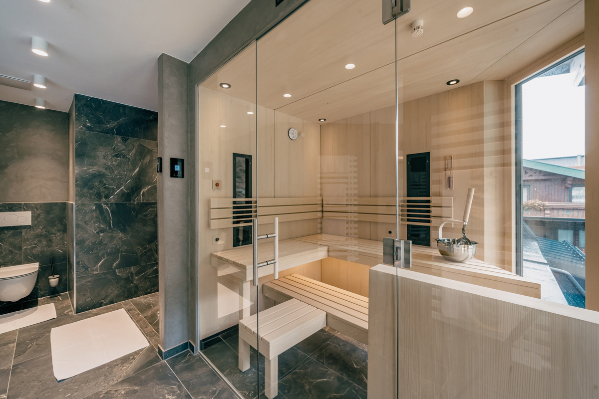 70 m² ložnice s manželskou postelí, obývací pokoj s krbem a rozkládacím gaučem pro 2 osoby, sociální zařízení se sprchou a vanou, panorama saunou, oddělené WC, balkon s výhledem na hory