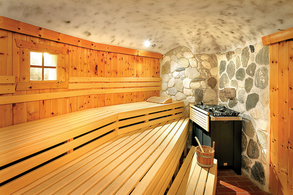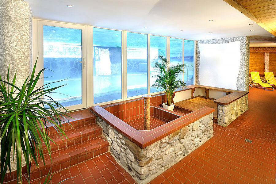 vnitřní a venkovní bazén 72 m² s umělým vodopádem, venkovní dětský bazének, finská sauna, pára, infrakabina, horizontální solárium*, relaxační koutek s lehátky, masáže*
