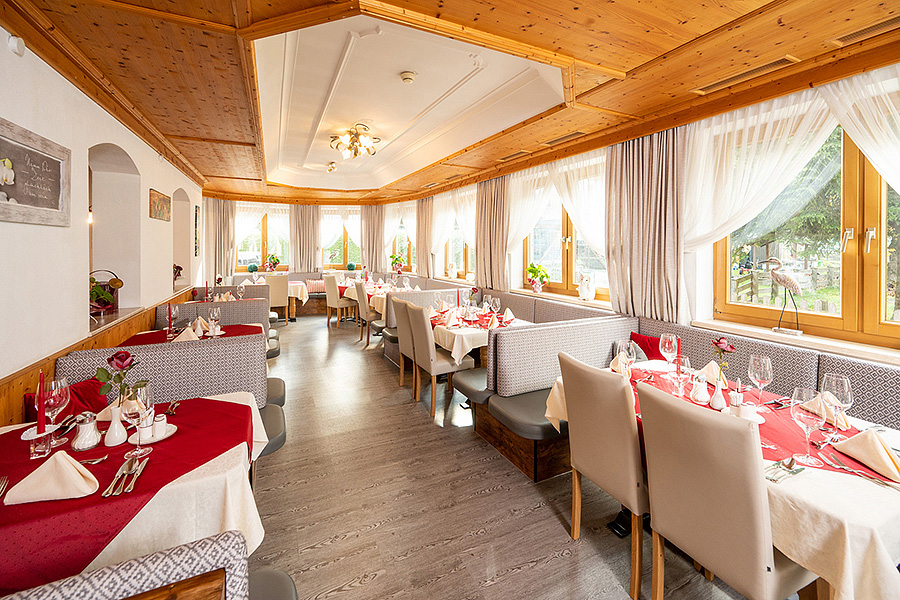 servírované menu s výběrem z 3 hlavních jídel s přílohou, servírovaný studený předkrm, servírovaná polévka, salátový bufet, servírovaný dezert, nápoje za poplatek; několikrát týdně večeře formou tématického bufetu