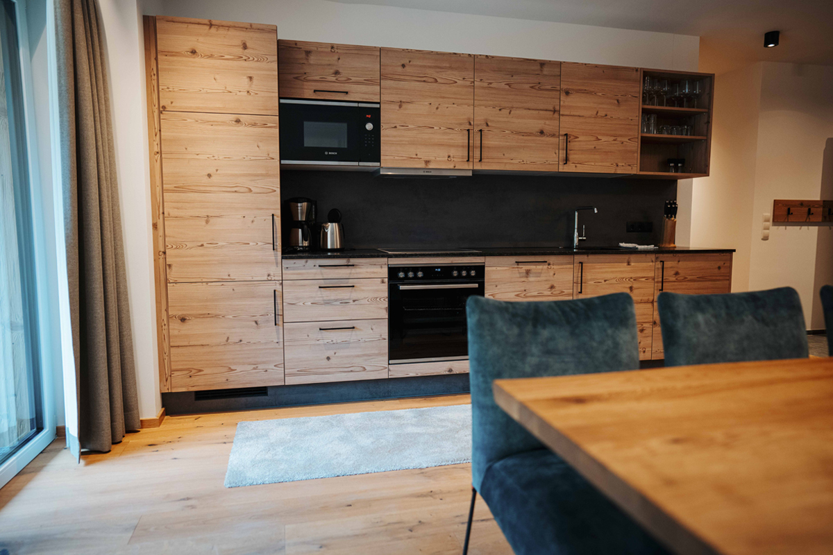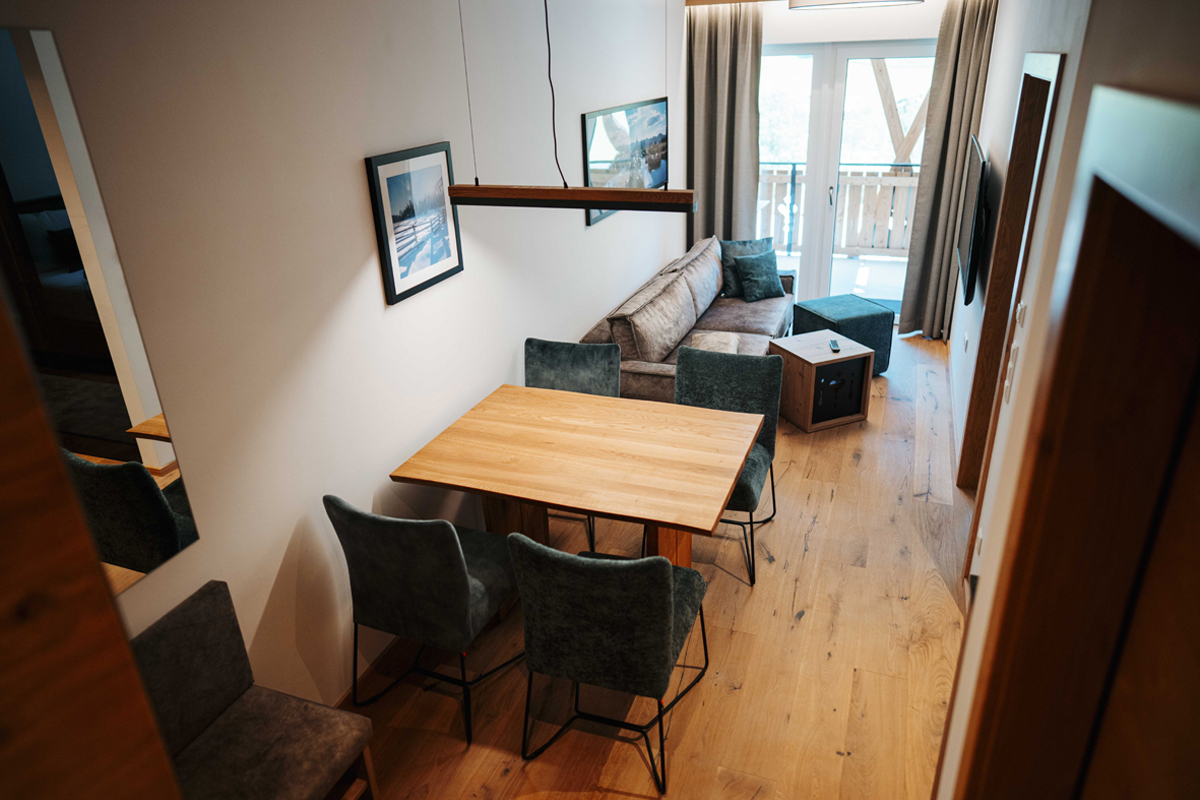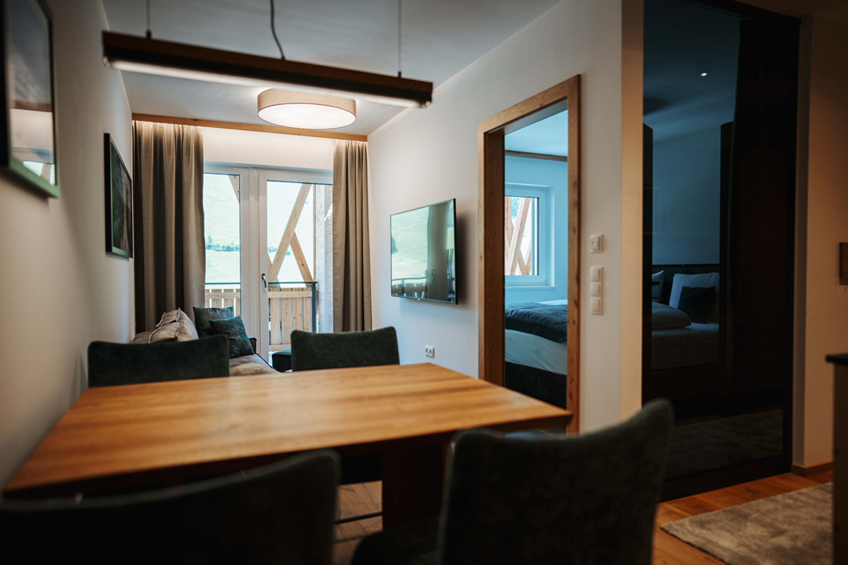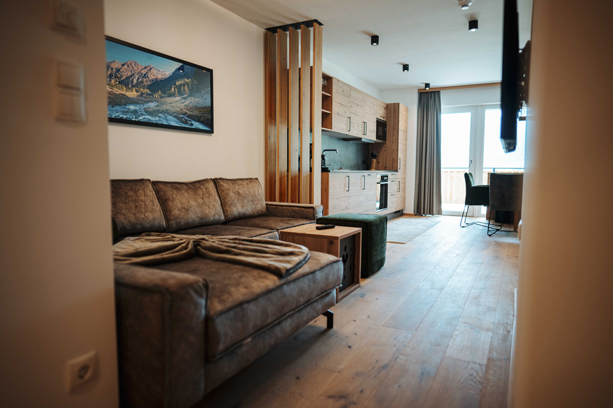 bilo 2+2 Hochalm - 35 m² - ložnice s manželskou postelí, obývací pokoj s kuchyňským koutem a rozkládacím gaučem až pro 2 děti do nedovršených 11 let, sociální zařízení se sprchou či vanou, balkon