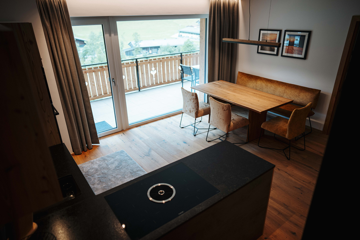 bilo 4 Kolmkarspitze - 50 m² - ložnice s manželskou postelí, obývací pokoj s kuchyňským koutem a rozkládacím gaučem pro 2 osoby, sociální zařízení se sprchou či vanou, oddělené WC, balkon