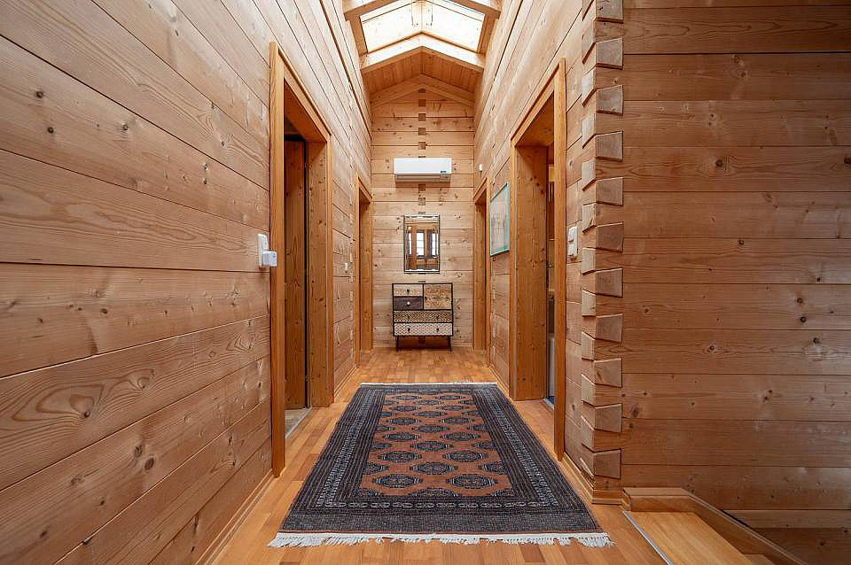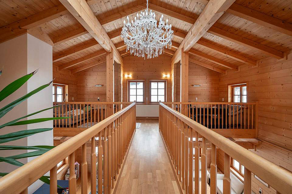 185 m² - suterén: ložnice s manželskou postelí a případně přistýlkou pro 1 osobu, sociální zařízení; přízemí: předsíň, velký obývací pokoj s krbem a s rozkládacím gaučem pro až 2 osoby, samostatná kuchyň, ložnice s manželskou postelí a případně přistýlkou pro 1 osobu a se sociálním zařízením, navíc jedno samostatné WC; 1. patro: 2 ložnice s palandou, ložnice s manželskou postelí, sociální zařízení, obývací prostor na galerii se 2 gauči; max. obsazení 12 osob, 13. a 14. osoba pouze na vyžádání včetně kalkulace