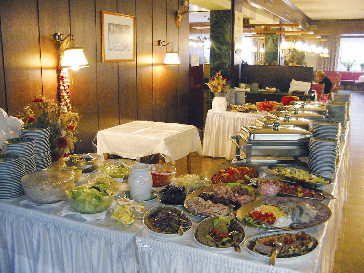 večeře - formou bufetu studených či teplých předkrmů, hlavních jídel, příloh, salátů a dezertů, nápoje za poplatek
