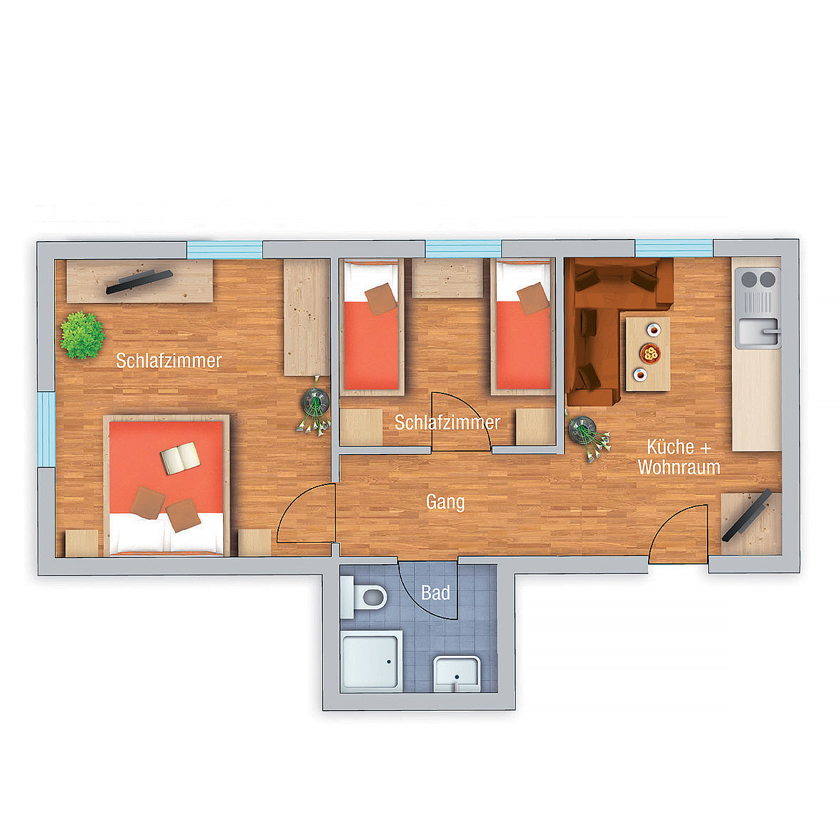 50 m² - 1 ložnice s manželskou postelí, 1 ložnice se 2 samostatnými lůžky, obývací pokoj s kuchyňským koutem, sociální zařízení, balkon