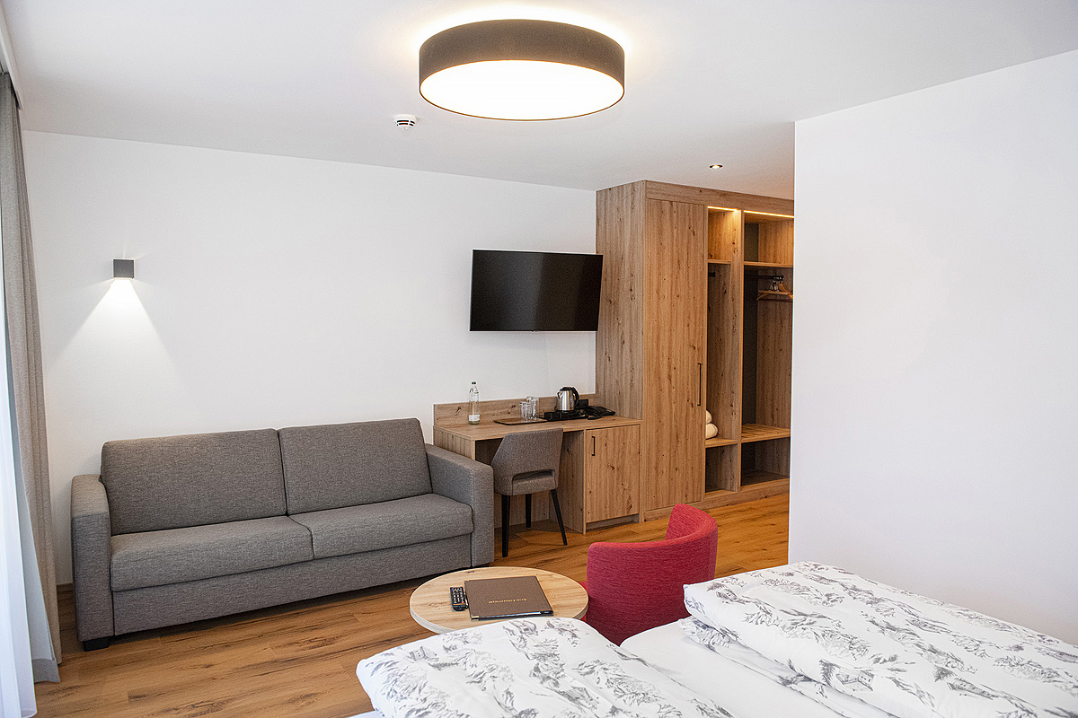 24 m² - pokoj s manželskou postelí a případně rozkládacím gaučem pro 1 až 2 osoby, sociální zařízení, balkon