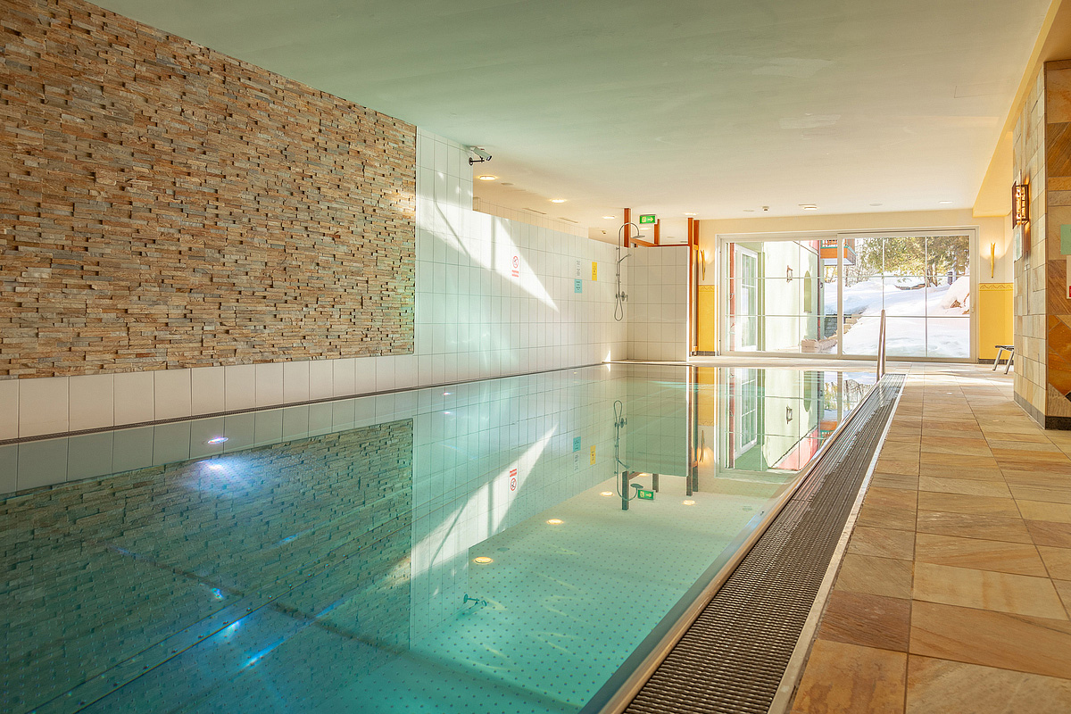 2x bazén 9 x 4,5 m (1x pouze pro dospělé), finská sauna, bio sauna, laconium - panoramatické sauna, pára, infrakabina, solná jeskyně, relaxační zóna, horizontální solárium*, masáže*, stolní tenis, biliár*