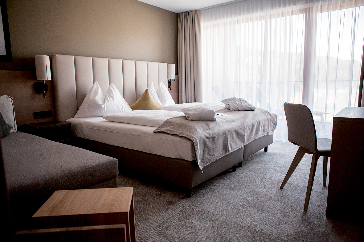 32 m² - stylový pokoj s manželskou postelí a rozkládacím gaučem pro 1 osobu, sociální zařízení s vanou a sprchou, oddělené WC, balkon