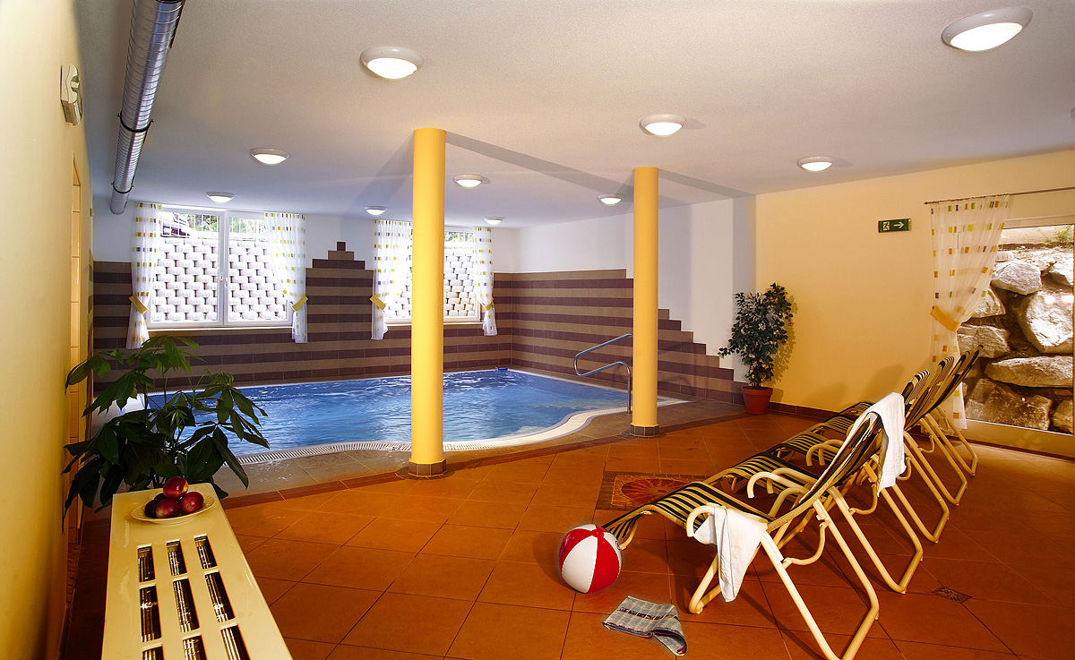 bazén 20 m², sauna#, pára#, horizontální solárium*#, infrakabina#, Kneippův chodník#, relaxační koutek s lehátky; posilovna#, stolní tenis*; služby označené # jsou pro děti přístupné až od 16 let