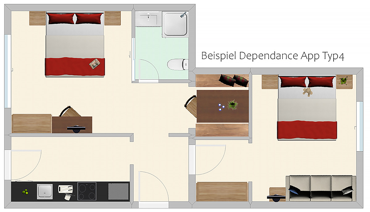 47 m² - 2 ložnice s manželskou postelí, obývací pokoj s kuchyňským koutem, sociální zařízení